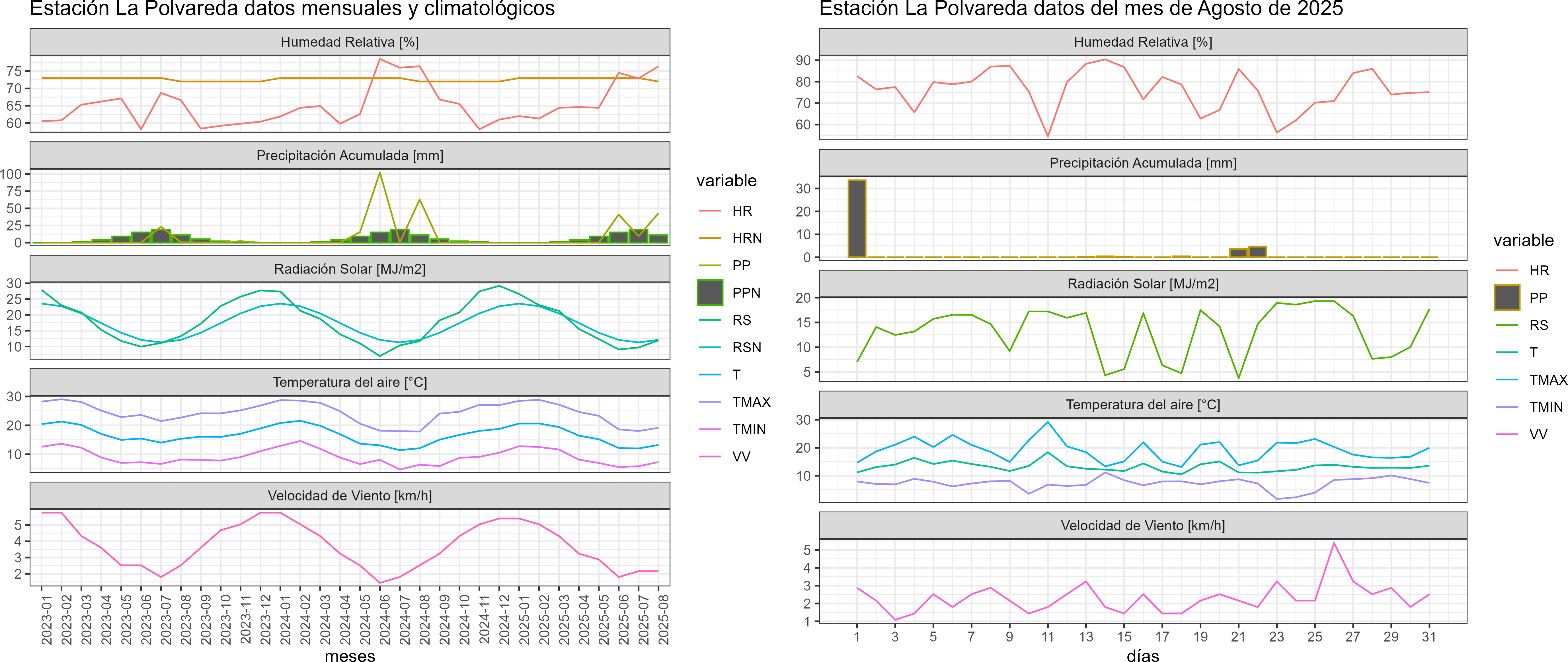 La estación La Polvareda corresponde al distrito agroclimático 3-4-2. Para este distrito climático la temperatura mínima, media y máxima climatológicas alcanzan los 5.3°C, 12.5°C y 19.7°C respectivamente. Por su parte, respecto a las temperaturas medidas durante el mes de agosto en la estación: la temperatura mínima alcanzo los 7.3°C (2°C sobre la climatológica), la temperatura media 13.2°C (0.7°C sobre la climatológica) y la temperatura máxima llegó a los 19.2°C (-0.5°C bajo la climatológica). En el mes de agosto se registró una pluviometría de 43 mm, lo cual representa un 138.7% con respecto al mismo mes de un año normal. De enero a agosto se ha registrado un total acumulado de 93.6 mm, en circunstancias que un año normal registraría a la fecha 150 mm, lo que representa un déficit de 37.6%. A la misma fecha, durante el año 2024 la precipitación alcanzaba los 62.9 mm.