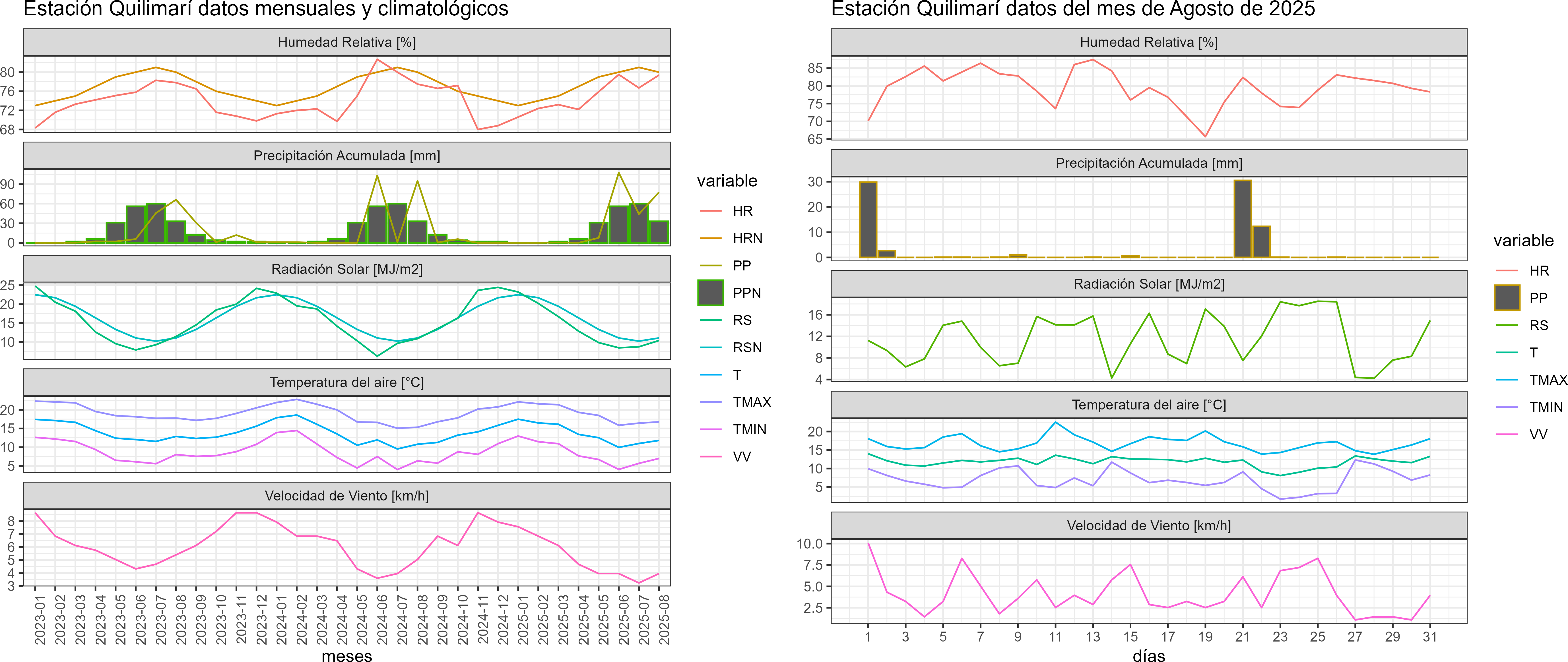 La estación Quilimarí corresponde al distrito agroclimático 4-1. Para este distrito climático la temperatura mínima, media y máxima climatológicas alcanzan los 5.9°C, 10.9°C y 15.8°C respectivamente. Por su parte, respecto a las temperaturas medidas durante el mes de agosto en la estación: la temperatura mínima alcanzo los 7°C (1.1°C sobre la climatológica), la temperatura media 11.8°C (0.9°C sobre la climatológica) y la temperatura máxima llegó a los 16.8°C (1°C sobre la climatológica). En el mes de agosto se registró una pluviometría de 77.6 mm, lo cual representa un 189.3% con respecto al mismo mes de un año normal. De enero a agosto se ha registrado un total acumulado de 237.5 mm, en circunstancias que un año normal registraría a la fecha 204 mm, lo que representa un superávit de 16.4%. A la misma fecha, durante el año 2024 la precipitación alcanzaba los 95 mm.