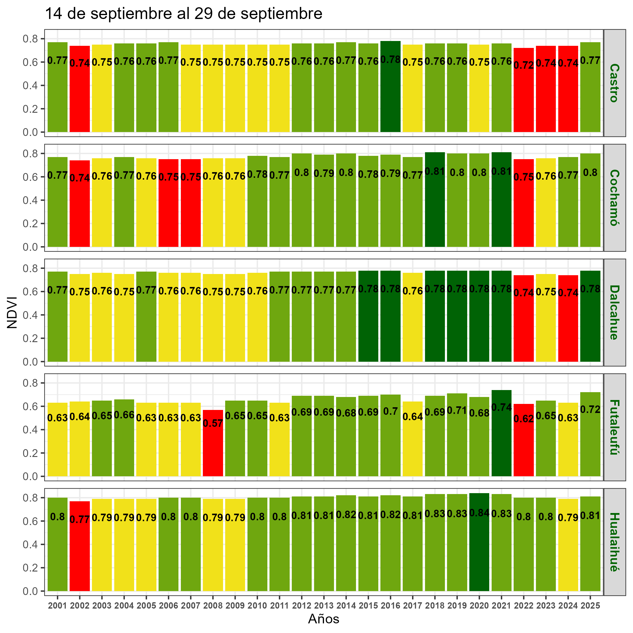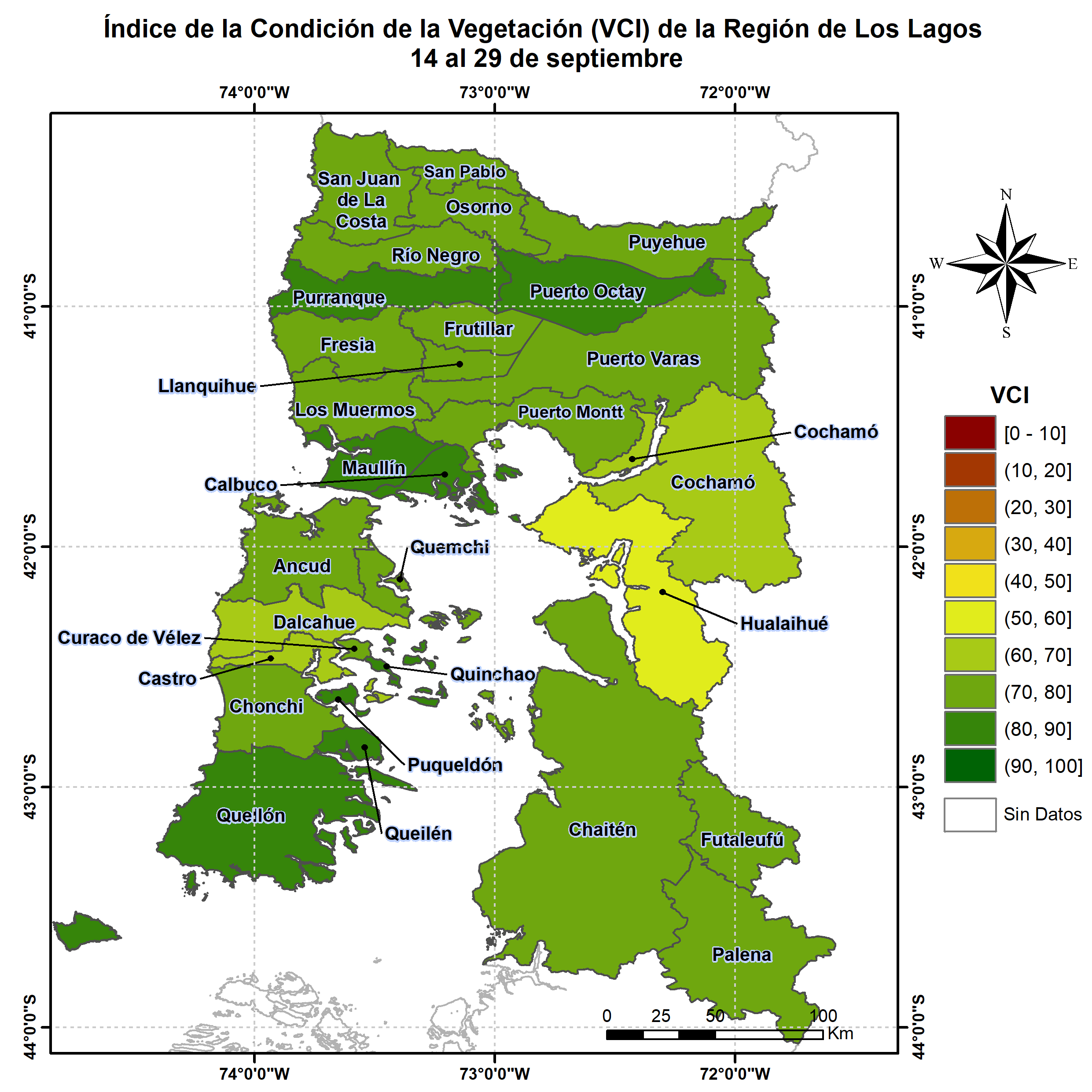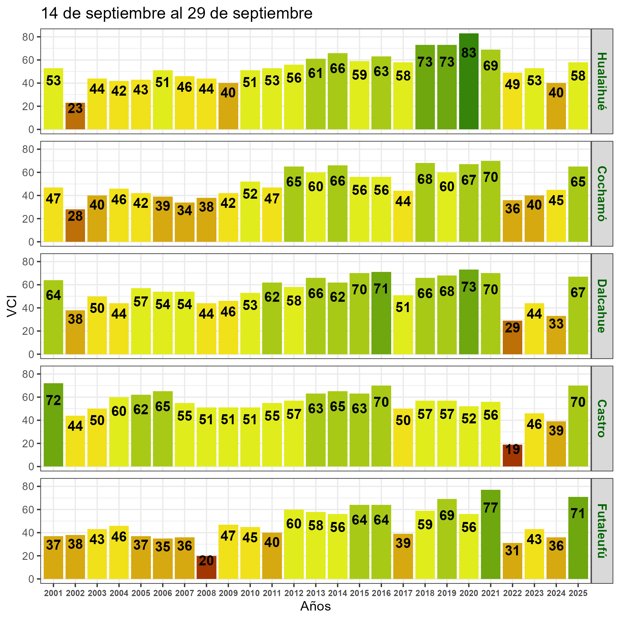 En términos globales la Región presentó un valor mediano de VCI de 76% para el período comprendido desde el 14 al 29 de septiembre. A igual período del año pasado presentaba un VCI de 50% (Fig. 1). De acuerdo a la Tabla 1 la Región de Los Lagos, en términos globales presenta una condición Favorable.