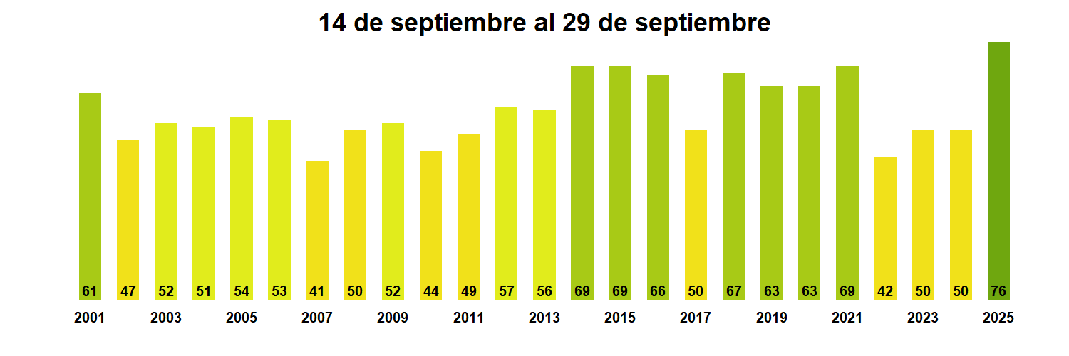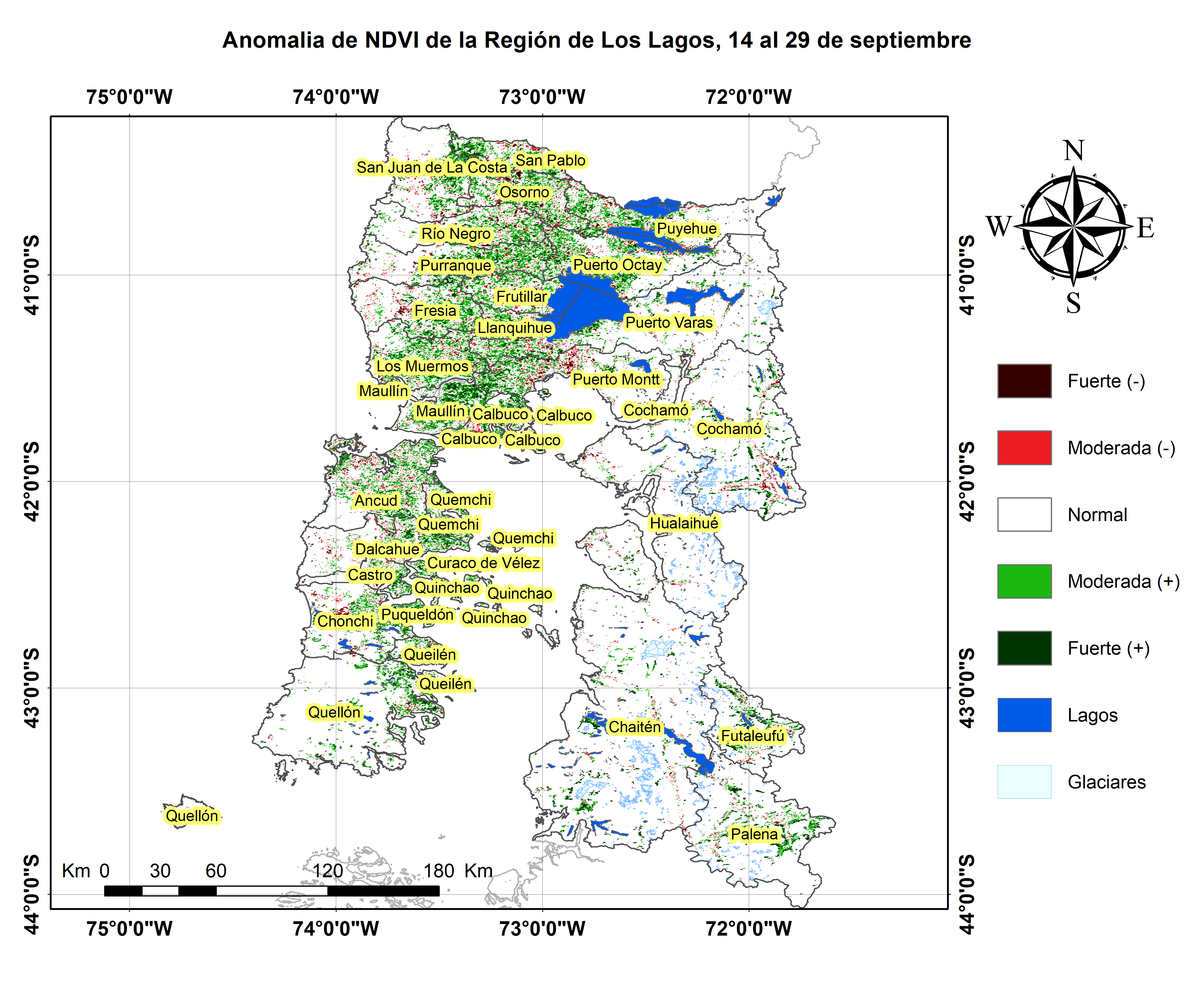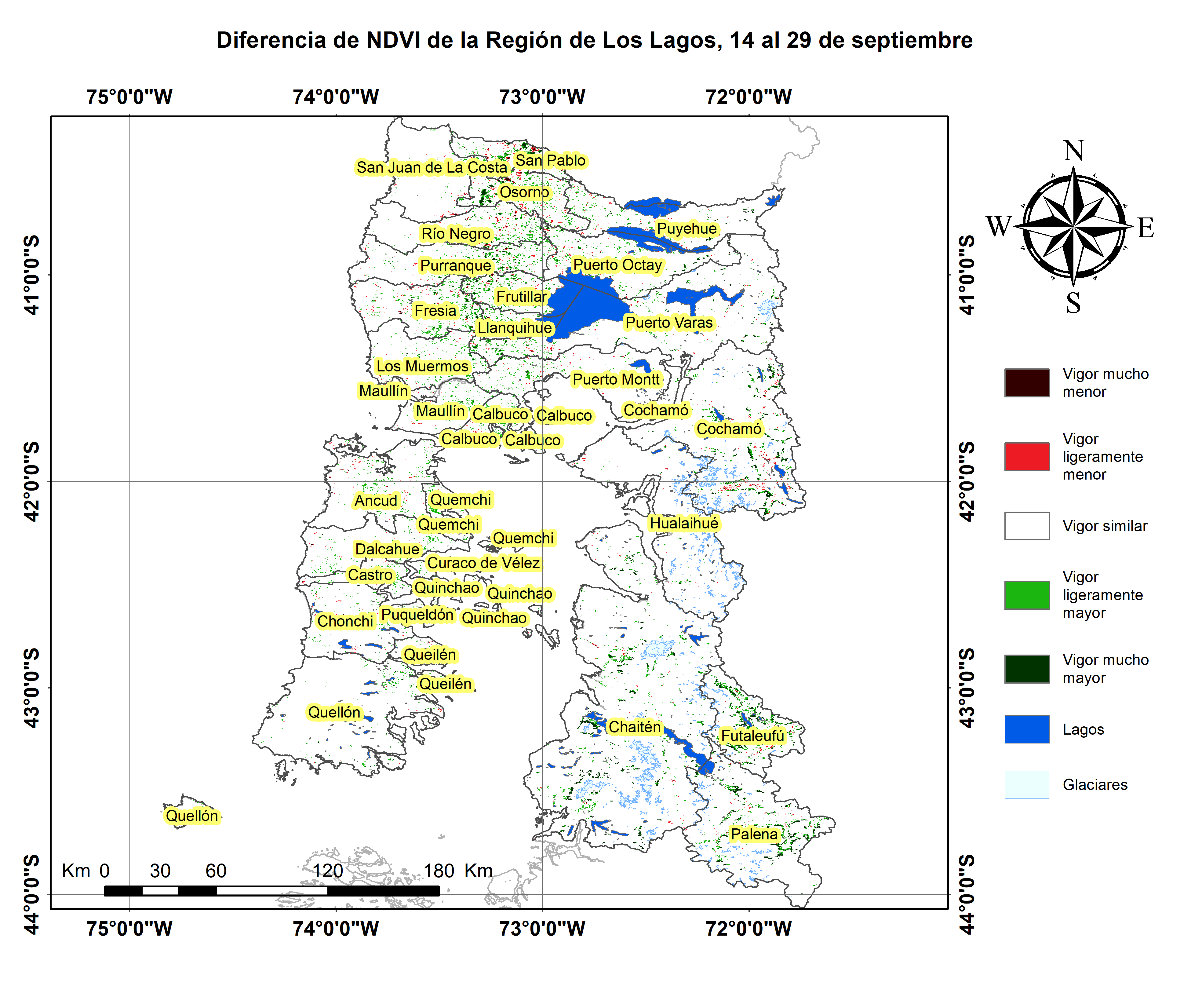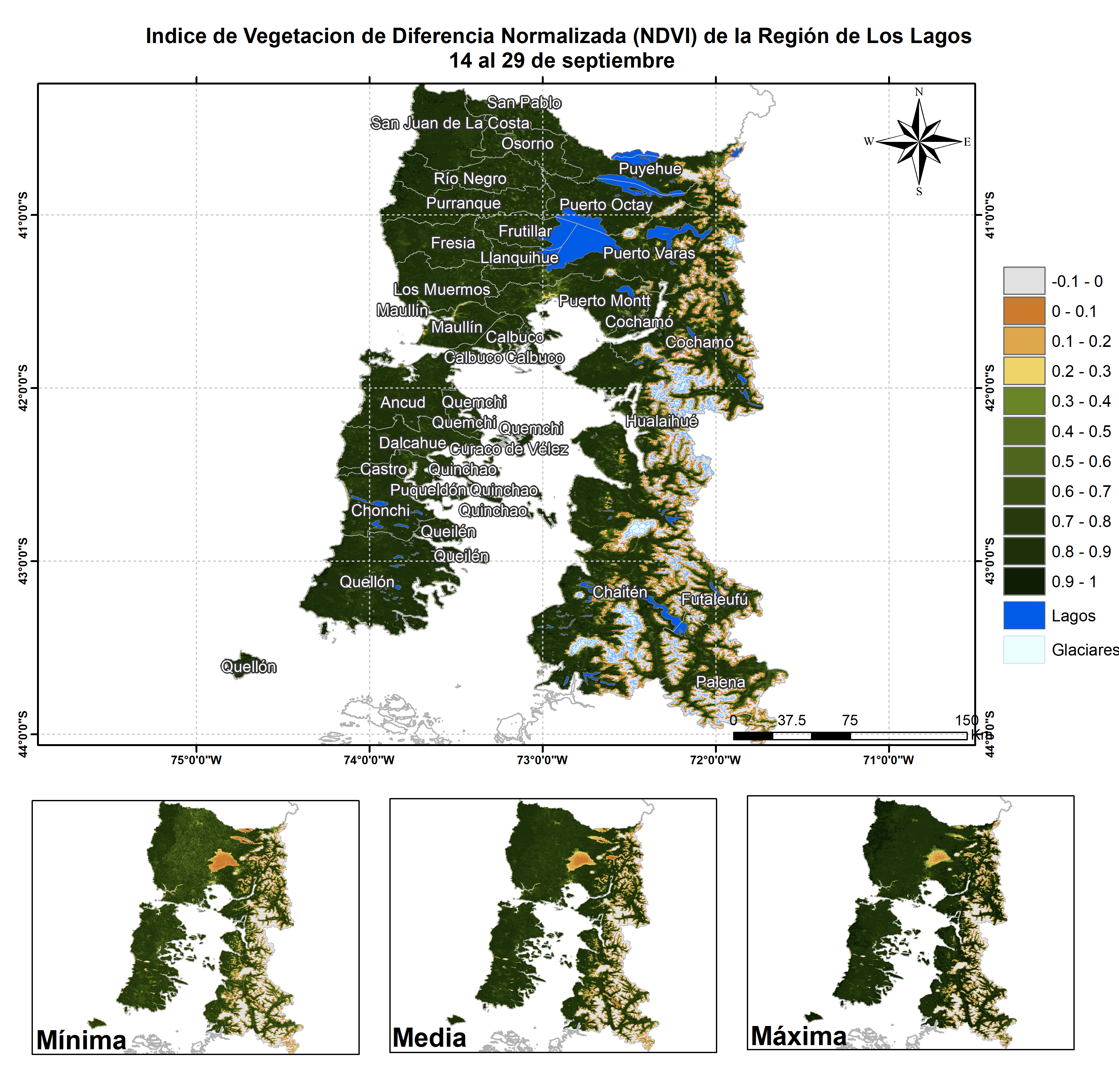 En términos globales la Región presentó un valor mediano de VCI de 76% para el período comprendido desde el 14 al 29 de septiembre. A igual período del año pasado presentaba un VCI de 50% (Fig. 1). De acuerdo a la Tabla 1 la Región de Los Lagos, en términos globales presenta una condición Favorable.