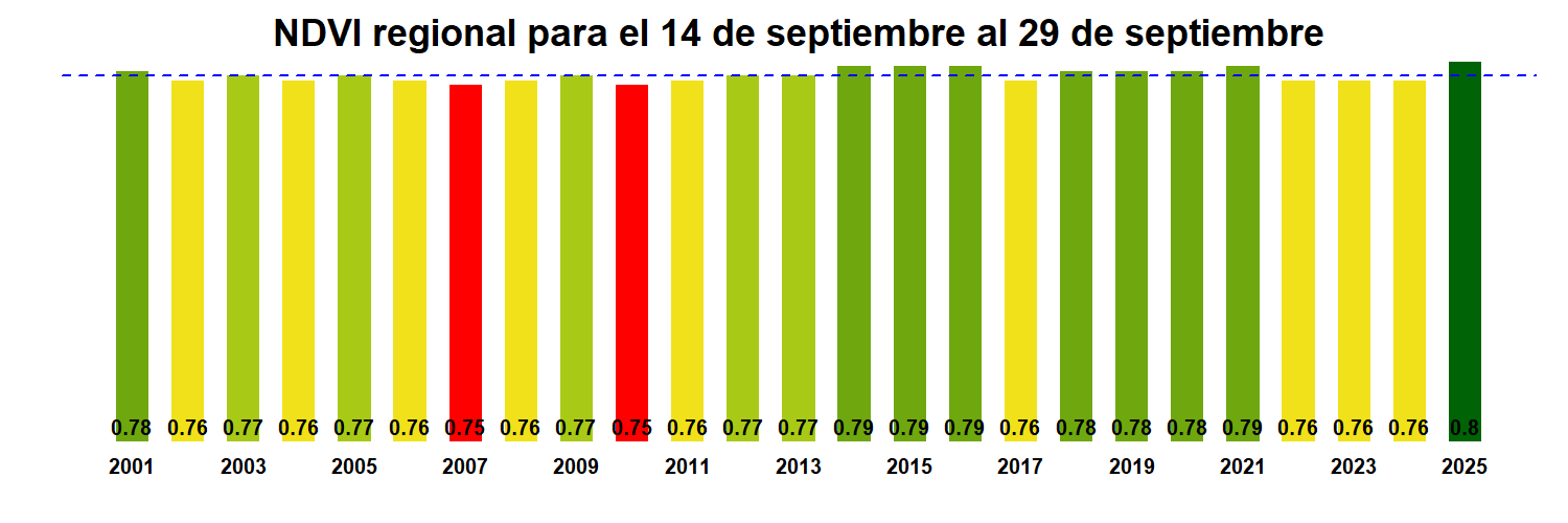 Para esta quincena se observa un NDVI promedio regional de 0.8 mientras el año pasado había sido de 0.76. El valor promedio histórico para esta región, en este período del año es de 0.77.