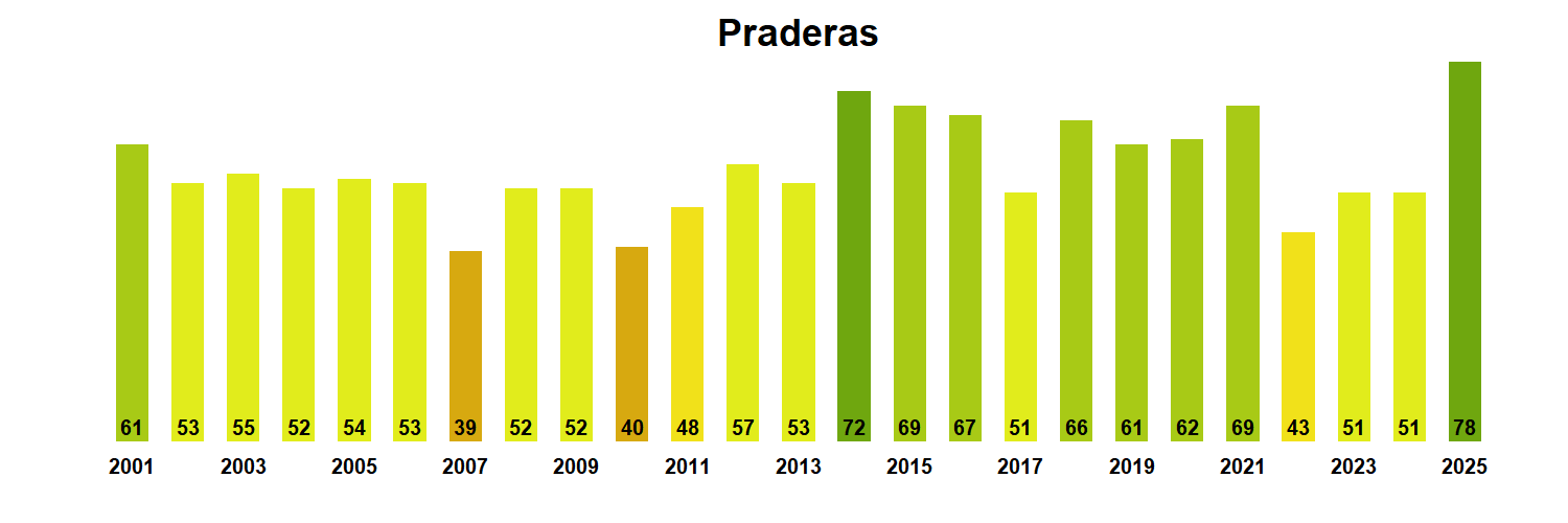 Respecto de la respuesta fisiológica de las plantas al efecto del clima, las imágenes satelitales reflejan la magnitud del crecimiento o disminución de la cobertura vegetal en esta época del año mediante el índice de vegetación NDVI (Desviación Normalizada del Índice de Vegetación).