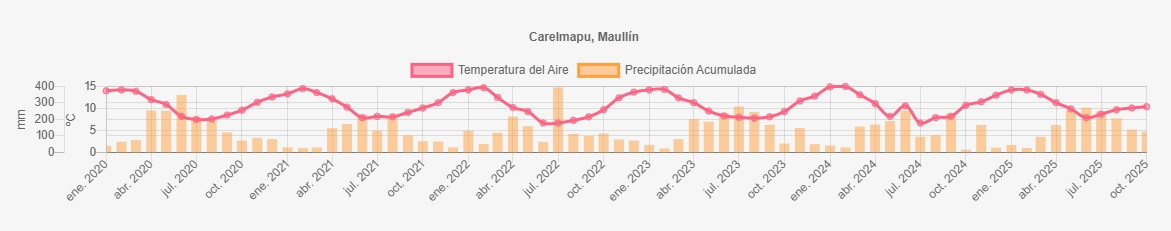 La estación Carelmapu corresponde al distrito agroclimático 14-10-3. Para este distrito climático la temperatura mínima, media y máxima climatológicas alcanzan los 4.9°C, 8.7°C y 12.5°C respectivamente. Por su parte, respecto a las temperaturas medidas durante el mes de septiembre en la estación: la temperatura mínima alcanzo los 6.7°C (1.8°C sobre la climatológica), la temperatura media 10.1°C (1.4°C sobre la climatológica) y la temperatura máxima llegó a los 13.5°C (1°C sobre la climatológica). En el mes de septiembre se registró una pluviometría de 138.6 mm, lo cual representa un 102.7% con respecto al mismo mes de un año normal. De enero a septiembre se ha registrado un total acumulado de 1451.9 mm, en circunstancias que un año normal registraría a la fecha 1414 mm, lo que representa un superávit de 2.7%. A la misma fecha, durante el año 2024 la precipitación alcanzaba los 236.9 mm.
