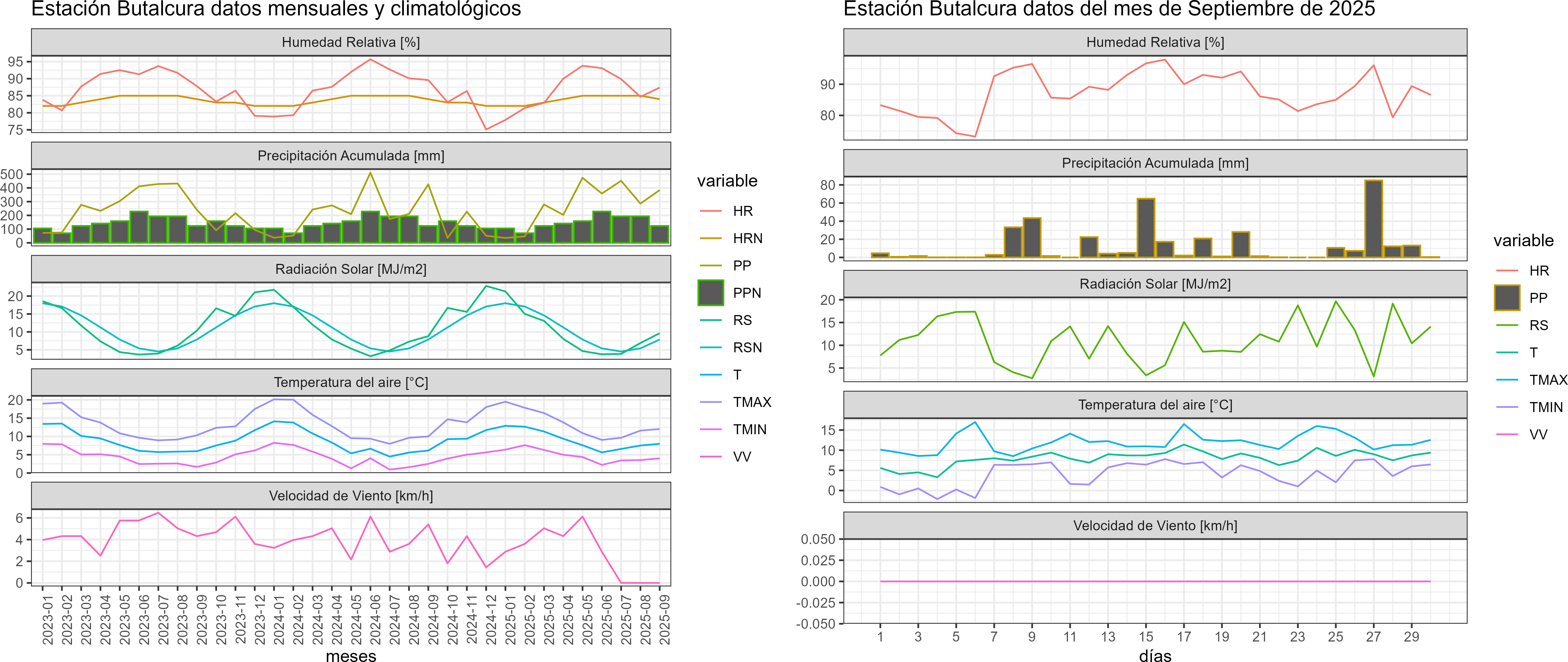La estación Butalcura corresponde al distrito agroclimático 10-4. Para este distrito climático la temperatura mínima, media y máxima climatológicas alcanzan los 3.9°C, 8.2°C y 12.4°C respectivamente. Por su parte, respecto a las temperaturas medidas durante el mes de septiembre en la estación: la temperatura mínima alcanzo los 4.1°C (0.2°C sobre la climatológica), la temperatura media 8°C (-0.2°C bajo la climatológica) y la temperatura máxima llegó a los 11.9°C (-0.5°C bajo la climatológica). En el mes de septiembre se registró una pluviometría de 384.1 mm, lo cual representa un 240.1% con respecto al mismo mes de un año normal. De enero a septiembre se ha registrado un total acumulado de 2520.2 mm, en circunstancias que un año normal registraría a la fecha 1568 mm, lo que representa un superávit de 60.7%. A la misma fecha, durante el año 2024 la precipitación alcanzaba los 425.6 mm.