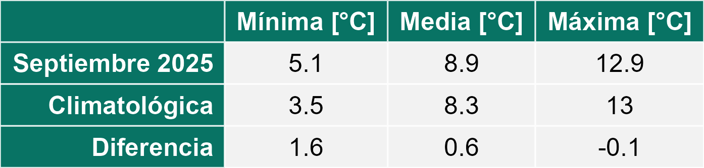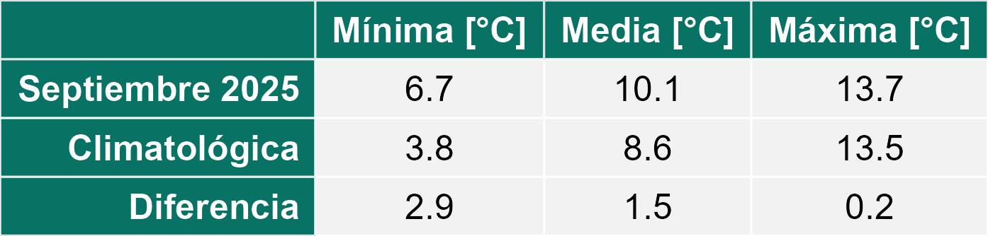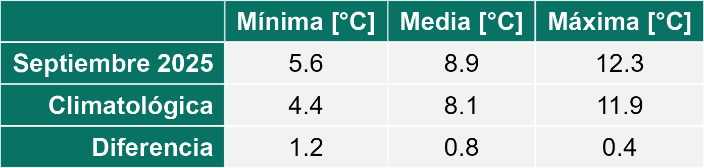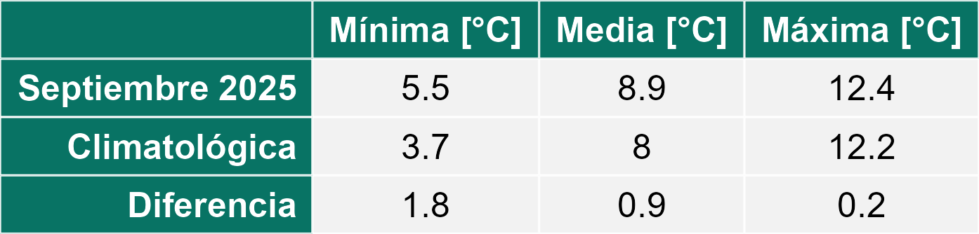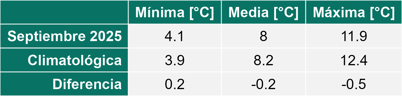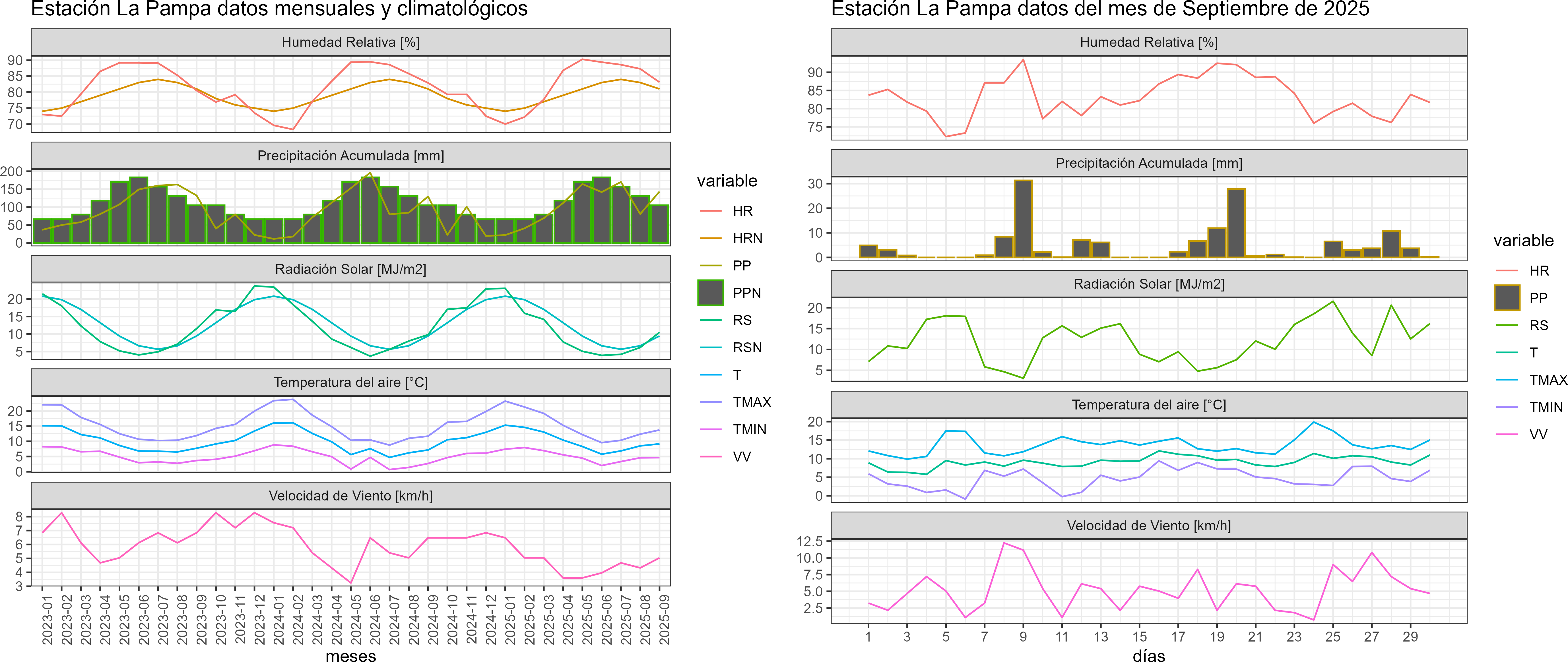 La estación La Pampa corresponde al distrito agroclimático 14-10-2. Para este distrito climático la temperatura mínima, media y máxima climatológicas alcanzan los 3.8°C, 8.8°C y 13.7°C respectivamente. Por su parte, respecto a las temperaturas medidas durante el mes de septiembre en la estación: la temperatura mínima alcanzo los 4.7°C (0.9°C sobre la climatológica), la temperatura media 9.2°C (0.4°C sobre la climatológica) y la temperatura máxima llegó a los 13.7°C (Igual la climatológico). En el mes de septiembre se registró una pluviometría de 143.4 mm, lo cual representa un 116.6% con respecto al mismo mes de un año normal. De enero a septiembre se ha registrado un total acumulado de 942.9 mm, en circunstancias que un año normal registraría a la fecha 1290 mm, lo que representa un déficit de 26.9%. A la misma fecha, durante el año 2024 la precipitación alcanzaba los 129.6 mm.