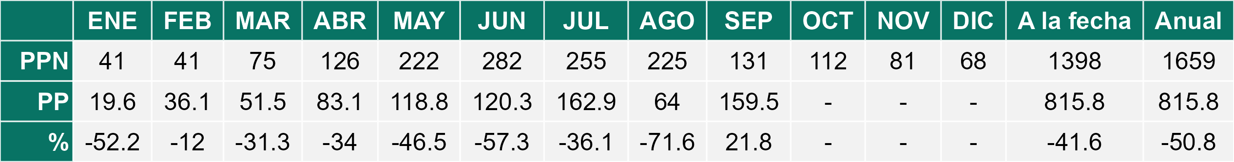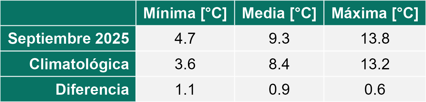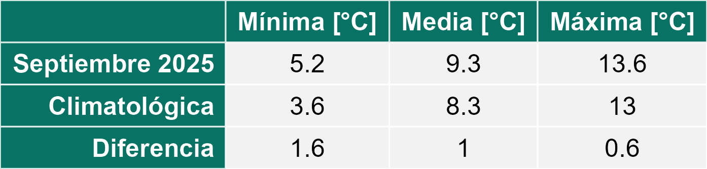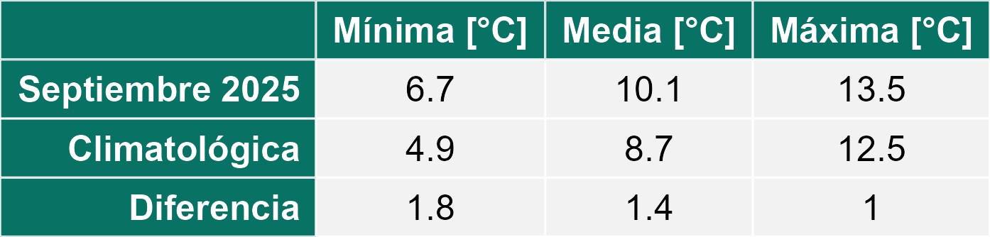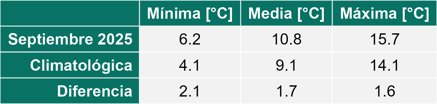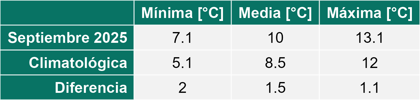 La estación La Pampa corresponde al distrito agroclimático 14-10-2. Para este distrito climático la temperatura mínima, media y máxima climatológicas alcanzan los 3.8°C, 8.8°C y 13.7°C respectivamente. Por su parte, respecto a las temperaturas medidas durante el mes de septiembre en la estación: la temperatura mínima alcanzo los 4.7°C (0.9°C sobre la climatológica), la temperatura media 9.2°C (0.4°C sobre la climatológica) y la temperatura máxima llegó a los 13.7°C (Igual la climatológico). En el mes de septiembre se registró una pluviometría de 143.4 mm, lo cual representa un 116.6% con respecto al mismo mes de un año normal. De enero a septiembre se ha registrado un total acumulado de 942.9 mm, en circunstancias que un año normal registraría a la fecha 1290 mm, lo que representa un déficit de 26.9%. A la misma fecha, durante el año 2024 la precipitación alcanzaba los 129.6 mm.