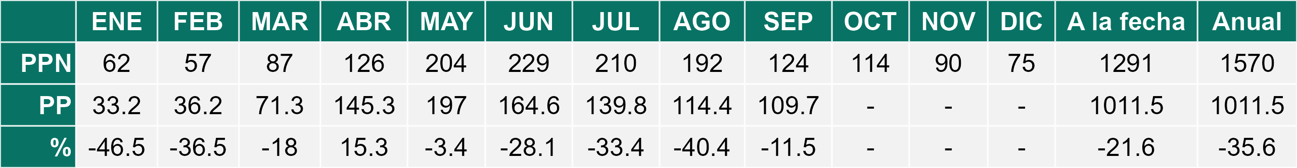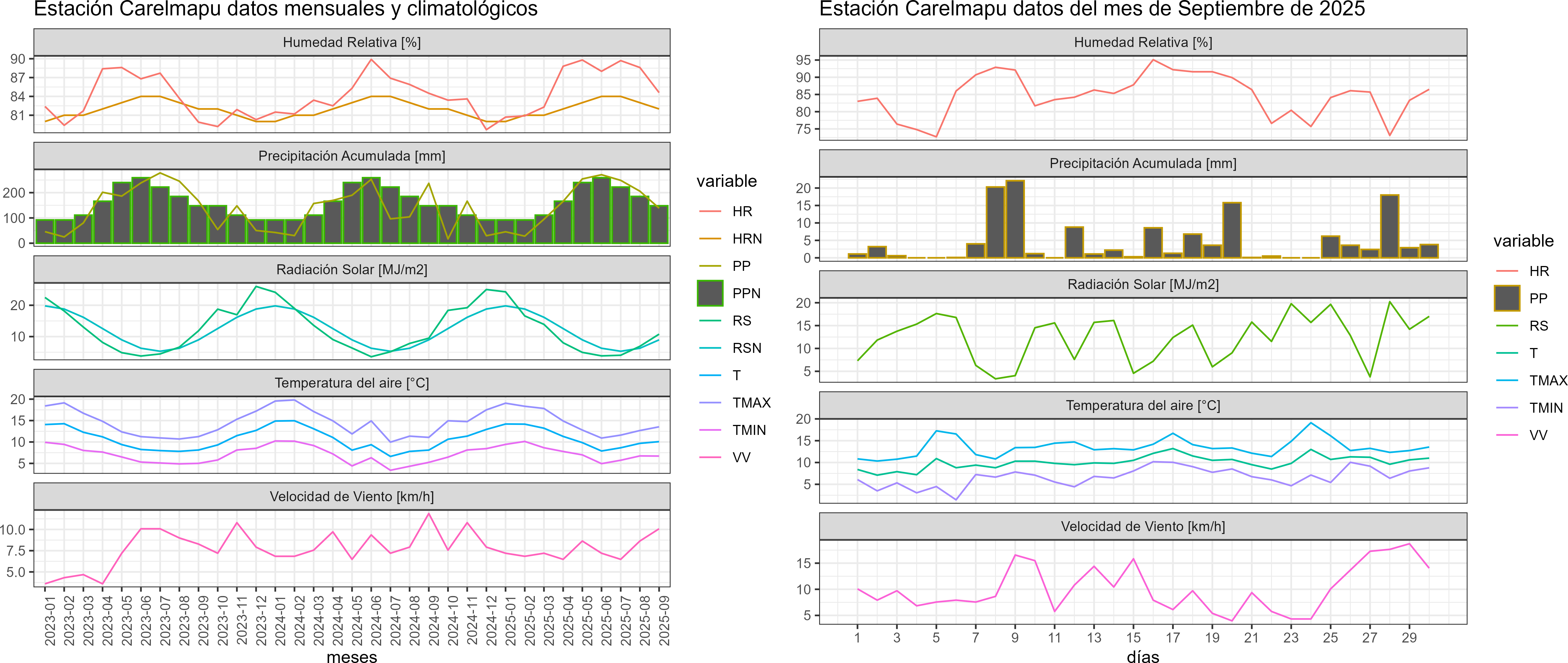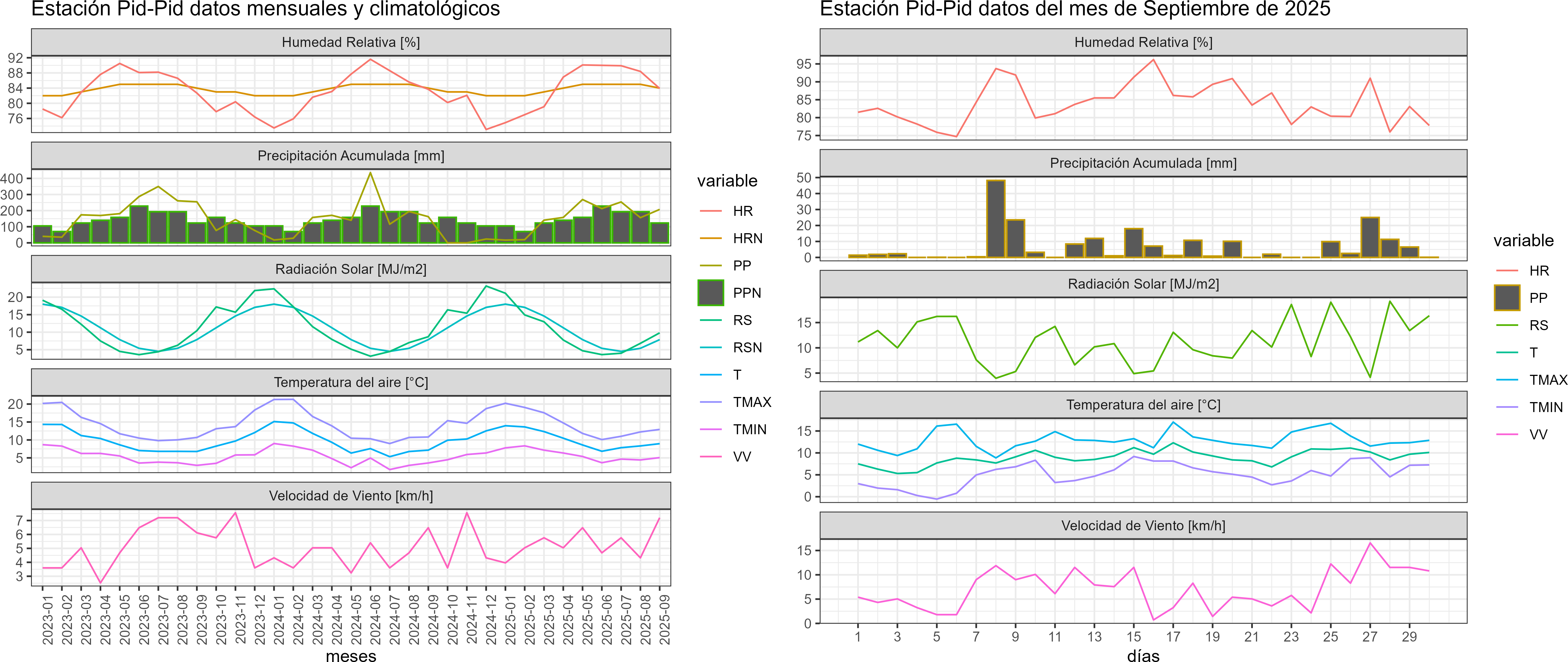La estación Pid-Pid corresponde al distrito agroclimático 10-4. Para este distrito climático la temperatura mínima, media y máxima climatológicas alcanzan los 3.5°C, 8.3°C y 13°C respectivamente. Por su parte, respecto a las temperaturas medidas durante el mes de septiembre en la estación: la temperatura mínima alcanzo los 5.1°C (1.6°C sobre la climatológica), la temperatura media 8.9°C (0.6°C sobre la climatológica) y la temperatura máxima llegó a los 12.9°C (-0.1°C bajo la climatológica). En el mes de septiembre se registró una pluviometría de 207.5 mm, lo cual representa un 122.1% con respecto al mismo mes de un año normal. De enero a septiembre se ha registrado un total acumulado de 1433.7 mm, en circunstancias que un año normal registraría a la fecha 1628 mm, lo que representa un déficit de 11.9%. A la misma fecha, durante el año 2024 la precipitación alcanzaba los 162.5 mm.