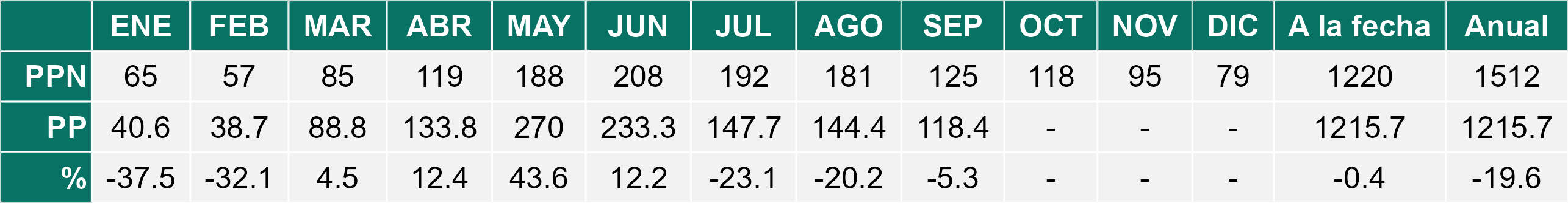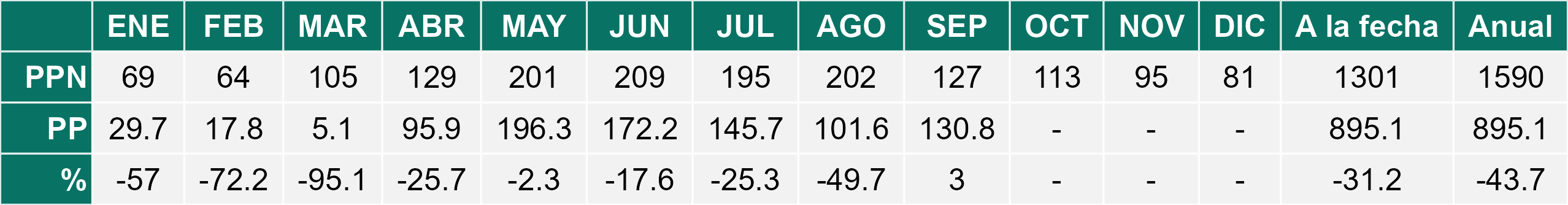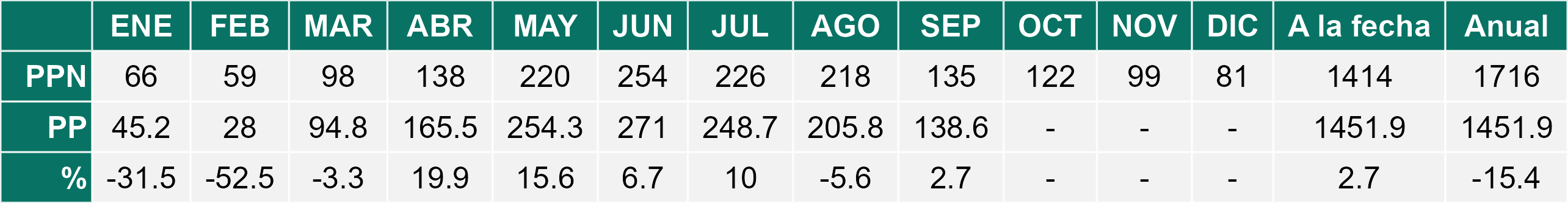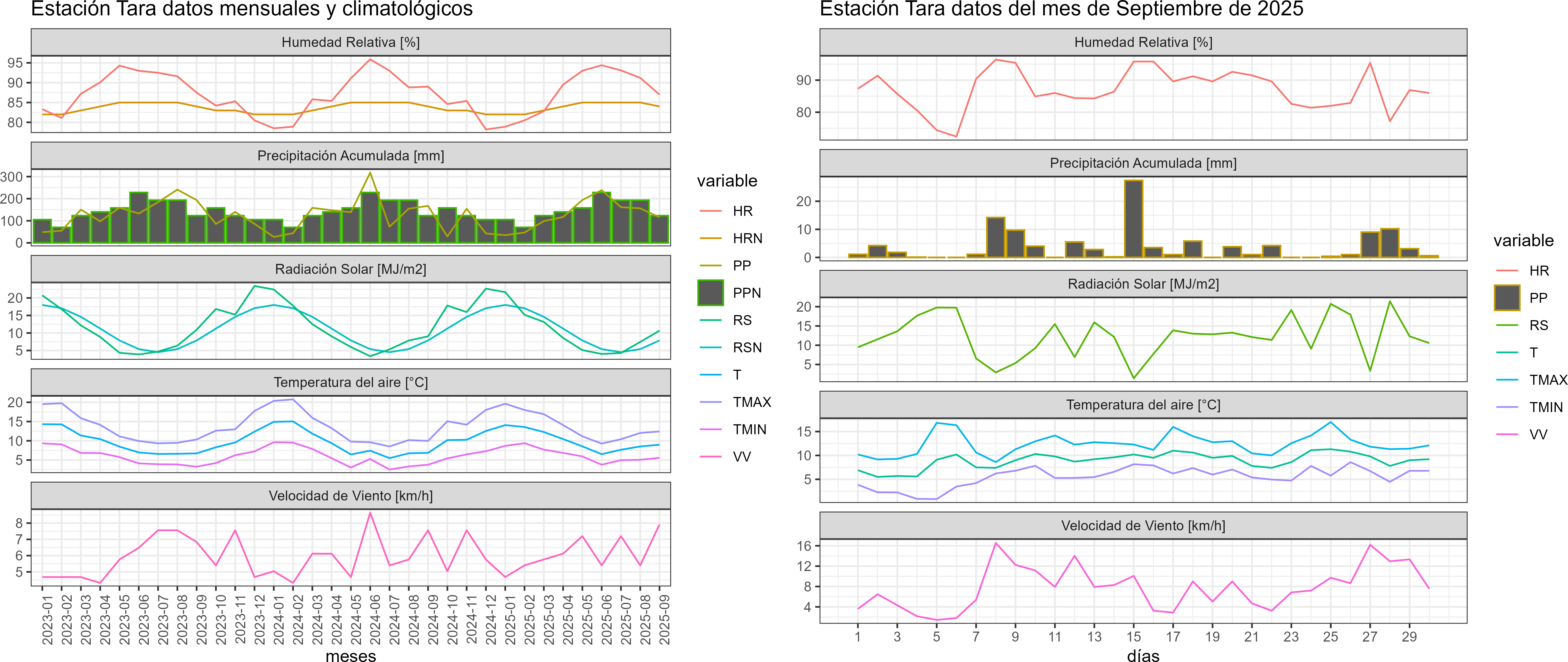 La estación Tara corresponde al distrito agroclimático 10-4. Para este distrito climático la temperatura mínima, media y máxima climatológicas alcanzan los 3.7°C, 8°C y 12.2°C respectivamente. Por su parte, respecto a las temperaturas medidas durante el mes de septiembre en la estación: la temperatura mínima alcanzo los 5.5°C (1.8°C sobre la climatológica), la temperatura media 8.9°C (0.9°C sobre la climatológica) y la temperatura máxima llegó a los 12.4°C (0.2°C sobre la climatológica). En el mes de septiembre se registró una pluviometría de 115.7 mm, lo cual representa un 85.7% con respecto al mismo mes de un año normal. De enero a septiembre se ha registrado un total acumulado de 1162.9 mm, en circunstancias que un año normal registraría a la fecha 1340 mm, lo que representa un déficit de 13.2%. A la misma fecha, durante el año 2024 la precipitación alcanzaba los 167.3 mm.