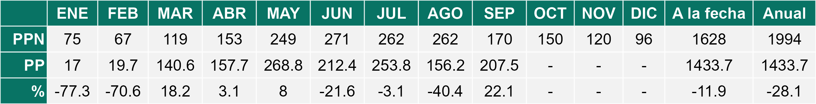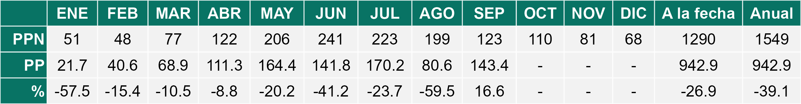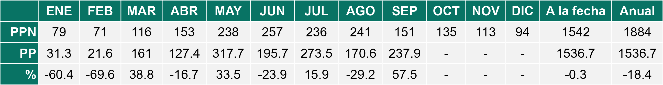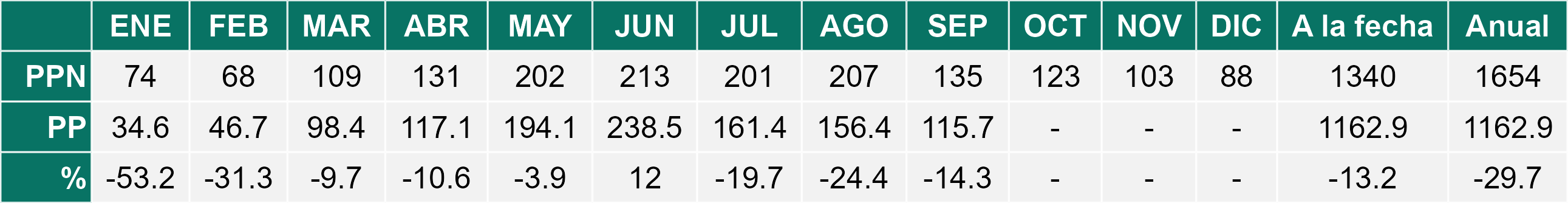 La estación Tara corresponde al distrito agroclimático 10-4. Para este distrito climático la temperatura mínima, media y máxima climatológicas alcanzan los 3.7°C, 8°C y 12.2°C respectivamente. Por su parte, respecto a las temperaturas medidas durante el mes de septiembre en la estación: la temperatura mínima alcanzo los 5.5°C (1.8°C sobre la climatológica), la temperatura media 8.9°C (0.9°C sobre la climatológica) y la temperatura máxima llegó a los 12.4°C (0.2°C sobre la climatológica). En el mes de septiembre se registró una pluviometría de 115.7 mm, lo cual representa un 85.7% con respecto al mismo mes de un año normal. De enero a septiembre se ha registrado un total acumulado de 1162.9 mm, en circunstancias que un año normal registraría a la fecha 1340 mm, lo que representa un déficit de 13.2%. A la misma fecha, durante el año 2024 la precipitación alcanzaba los 167.3 mm.
