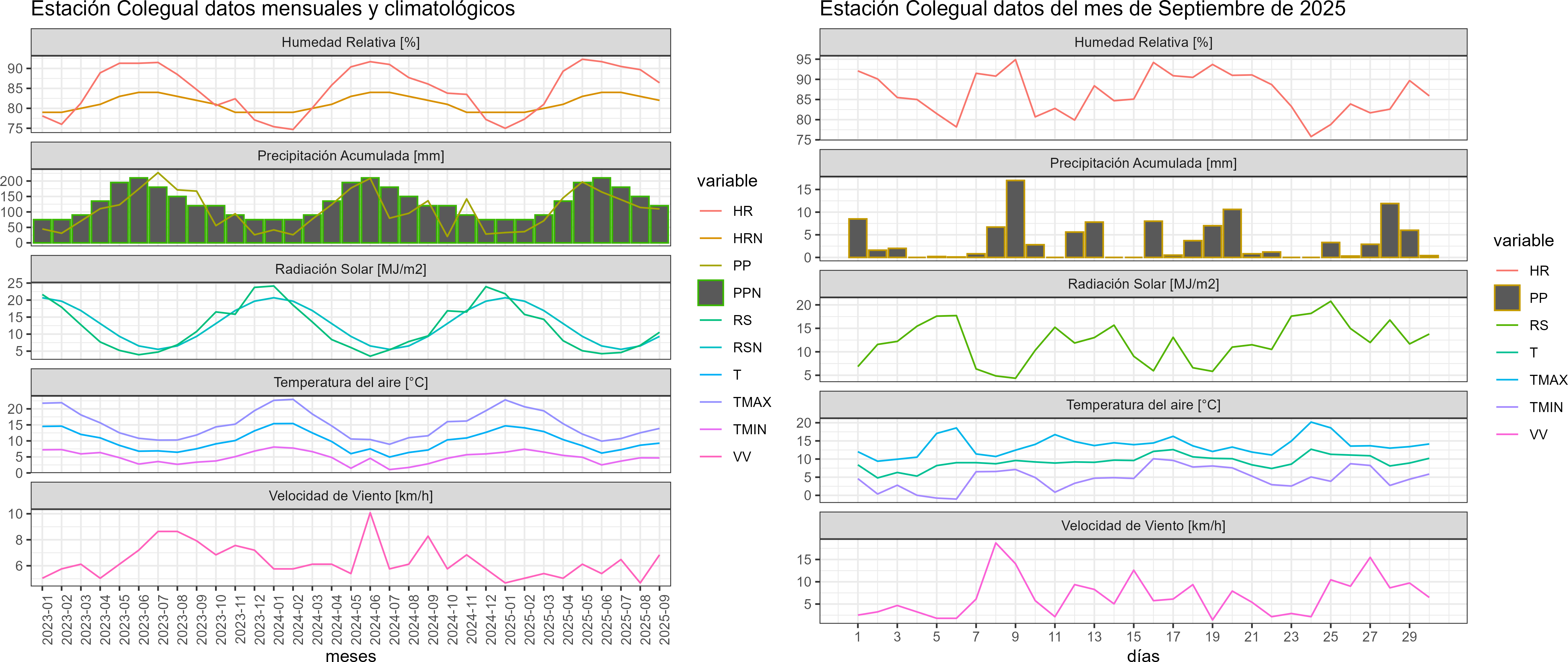 La estación Colegual corresponde al distrito agroclimático 14-10-1. Para este distrito climático la temperatura mínima, media y máxima climatológicas alcanzan los 3.6°C, 8.4°C y 13.2°C respectivamente. Por su parte, respecto a las temperaturas medidas durante el mes de septiembre en la estación: la temperatura mínima alcanzo los 4.7°C (1.1°C sobre la climatológica), la temperatura media 9.3°C (0.9°C sobre la climatológica) y la temperatura máxima llegó a los 13.8°C (0.6°C sobre la climatológica). En el mes de septiembre se registró una pluviometría de 109.7 mm, lo cual representa un 88.5% con respecto al mismo mes de un año normal. De enero a septiembre se ha registrado un total acumulado de 1011.5 mm, en circunstancias que un año normal registraría a la fecha 1291 mm, lo que representa un déficit de 21.6%. A la misma fecha, durante el año 2024 la precipitación alcanzaba los 136.2 mm.