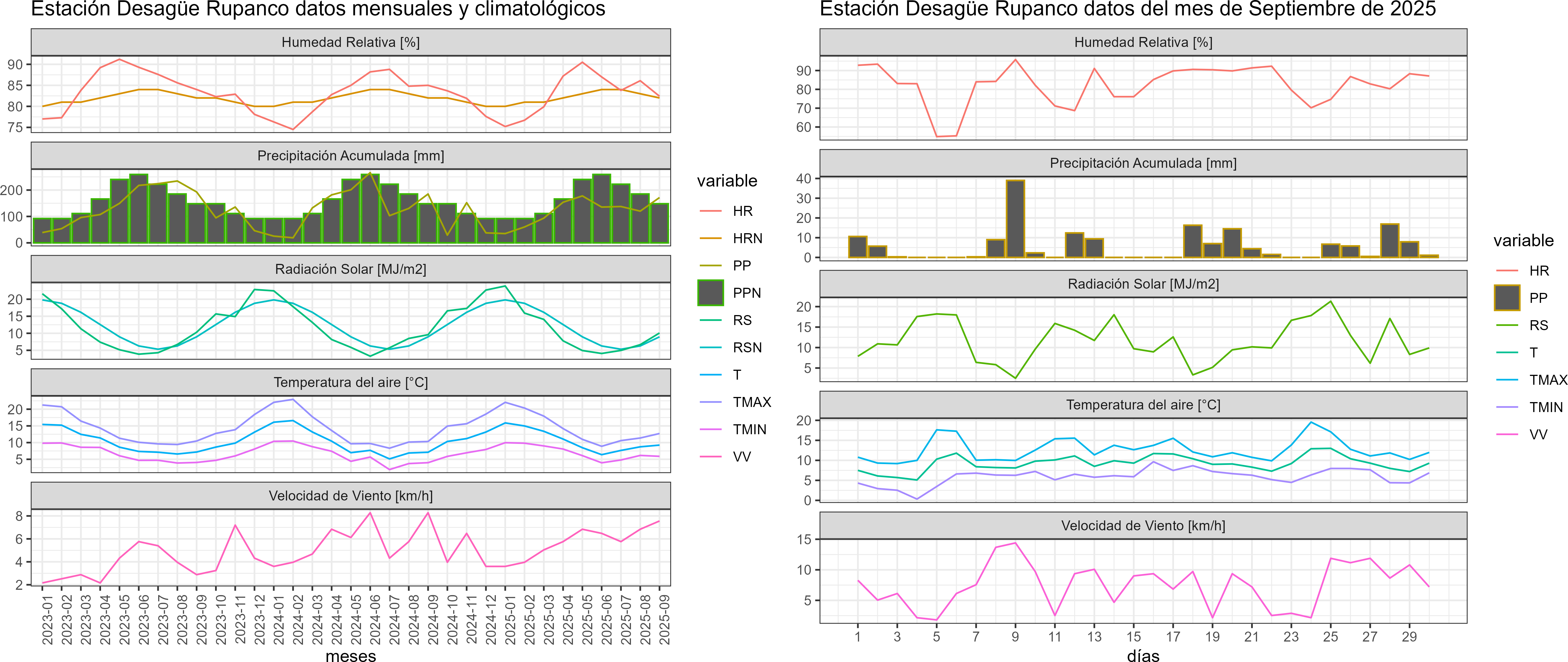 La estación Desagüe Rupanco corresponde al distrito agroclimático 14-10-3. Para este distrito climático la temperatura mínima, media y máxima climatológicas alcanzan los 4.5°C, 8.9°C y 13.3°C respectivamente. Por su parte, respecto a las temperaturas medidas durante el mes de septiembre en la estación: la temperatura mínima alcanzo los 5.9°C (1.4°C sobre la climatológica), la temperatura media 9.2°C (0.3°C sobre la climatológica) y la temperatura máxima llegó a los 12.6°C (-0.7°C bajo la climatológica). En el mes de septiembre se registró una pluviometría de 171.6 mm, lo cual representa un 116.7% con respecto al mismo mes de un año normal. De enero a septiembre se ha registrado un total acumulado de 1085.1 mm, en circunstancias que un año normal registraría a la fecha 1579 mm, lo que representa un déficit de 31.3%. A la misma fecha, durante el año 2024 la precipitación alcanzaba los 185 mm.