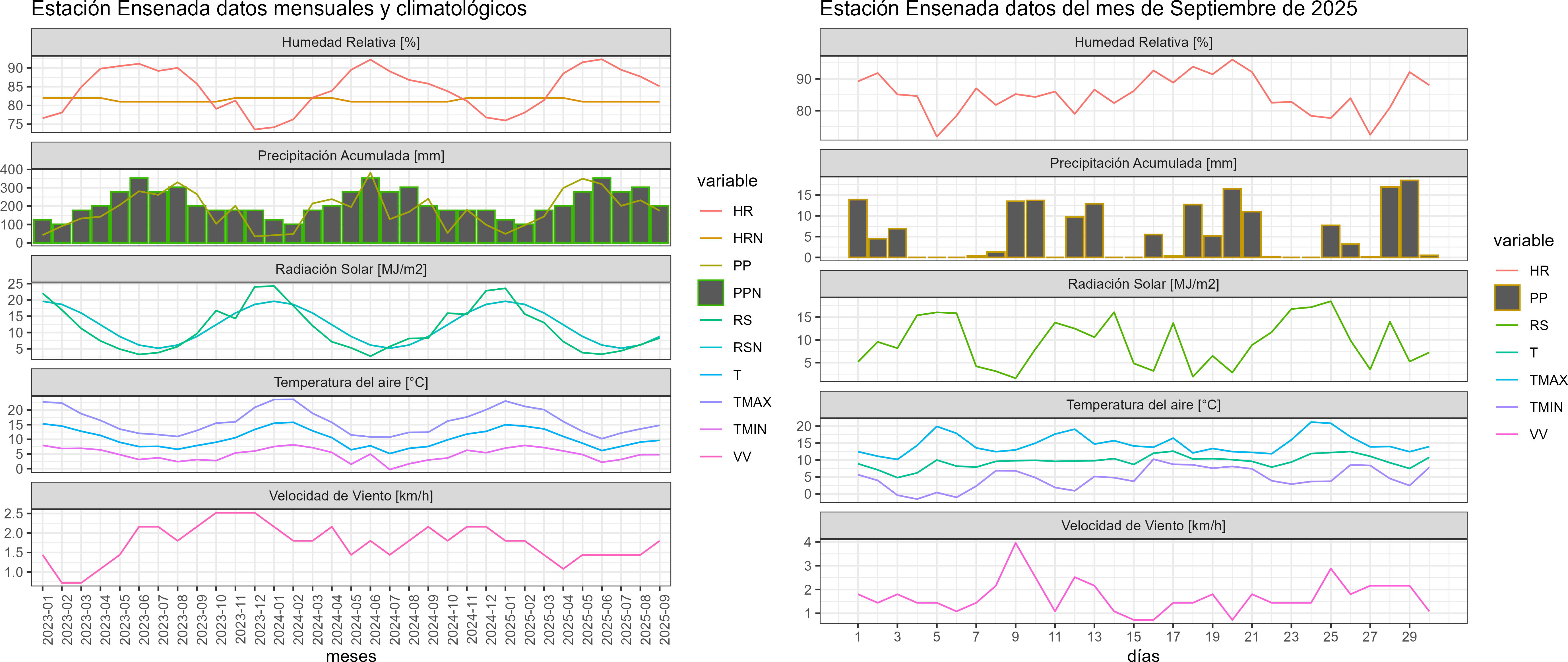 La estación Ensenada corresponde al distrito agroclimático 14-10-4. Para este distrito climático la temperatura mínima, media y máxima climatológicas alcanzan los 4.6°C, 8.8°C y 13°C respectivamente. Por su parte, respecto a las temperaturas medidas durante el mes de septiembre en la estación: la temperatura mínima alcanzo los 4.7°C (0.1°C sobre la climatológica), la temperatura media 9.6°C (0.8°C sobre la climatológica) y la temperatura máxima llegó a los 14.7°C (1.7°C sobre la climatológica). En el mes de septiembre se registró una pluviometría de 175.1 mm, lo cual representa un 87.1% con respecto al mismo mes de un año normal. De enero a septiembre se ha registrado un total acumulado de 1865.7 mm, en circunstancias que un año normal registraría a la fecha 2148 mm, lo que representa un déficit de 13.1%. A la misma fecha, durante el año 2024 la precipitación alcanzaba los 240.4 mm.
