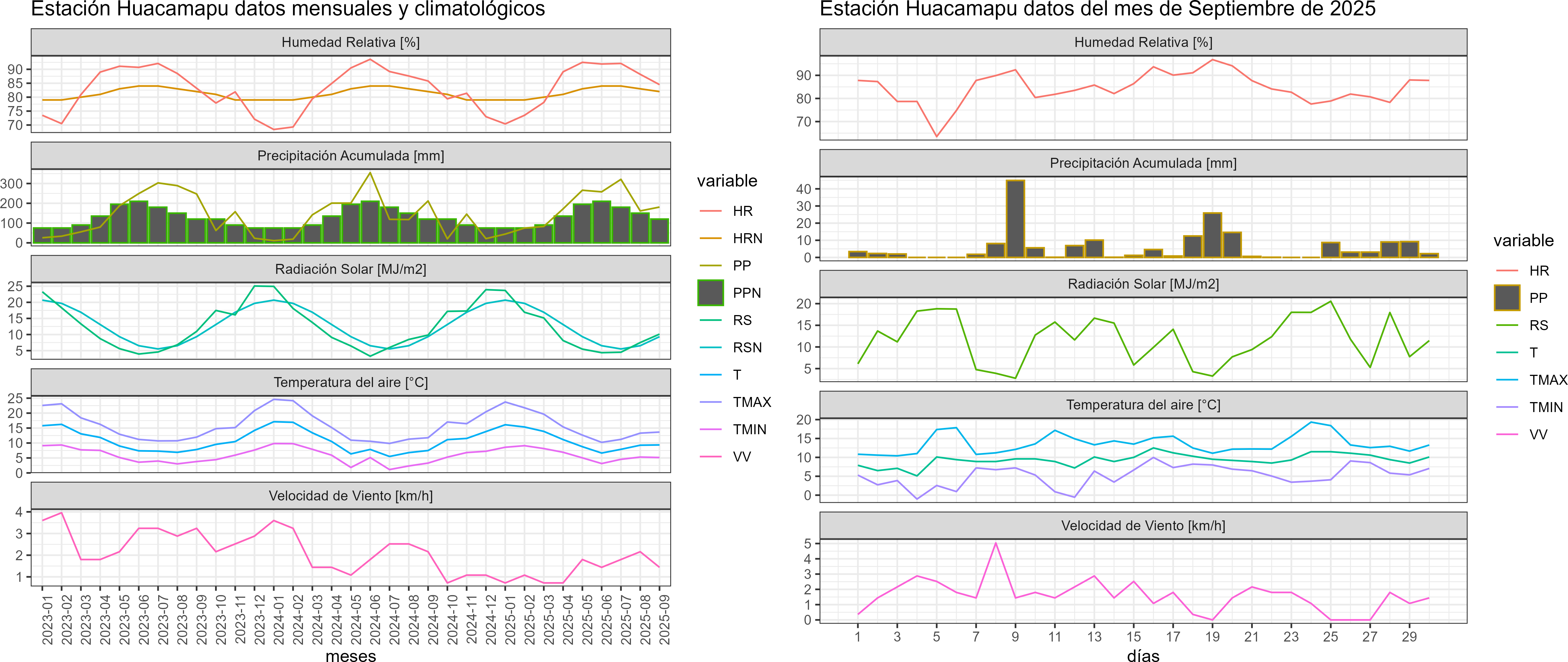 La estación Huacamapu corresponde al distrito agroclimático 14-10-1. Para este distrito climático la temperatura mínima, media y máxima climatológicas alcanzan los 3.6°C, 8.3°C y 13°C respectivamente. Por su parte, respecto a las temperaturas medidas durante el mes de septiembre en la estación: la temperatura mínima alcanzo los 5.2°C (1.6°C sobre la climatológica), la temperatura media 9.3°C (1°C sobre la climatológica) y la temperatura máxima llegó a los 13.6°C (0.6°C sobre la climatológica). En el mes de septiembre se registró una pluviometría de 180.9 mm, lo cual representa un 121.4% con respecto al mismo mes de un año normal. De enero a septiembre se ha registrado un total acumulado de 1560.8 mm, en circunstancias que un año normal registraría a la fecha 1606 mm, lo que representa un déficit de 2.8%. A la misma fecha, durante el año 2024 la precipitación alcanzaba los 211.8 mm.