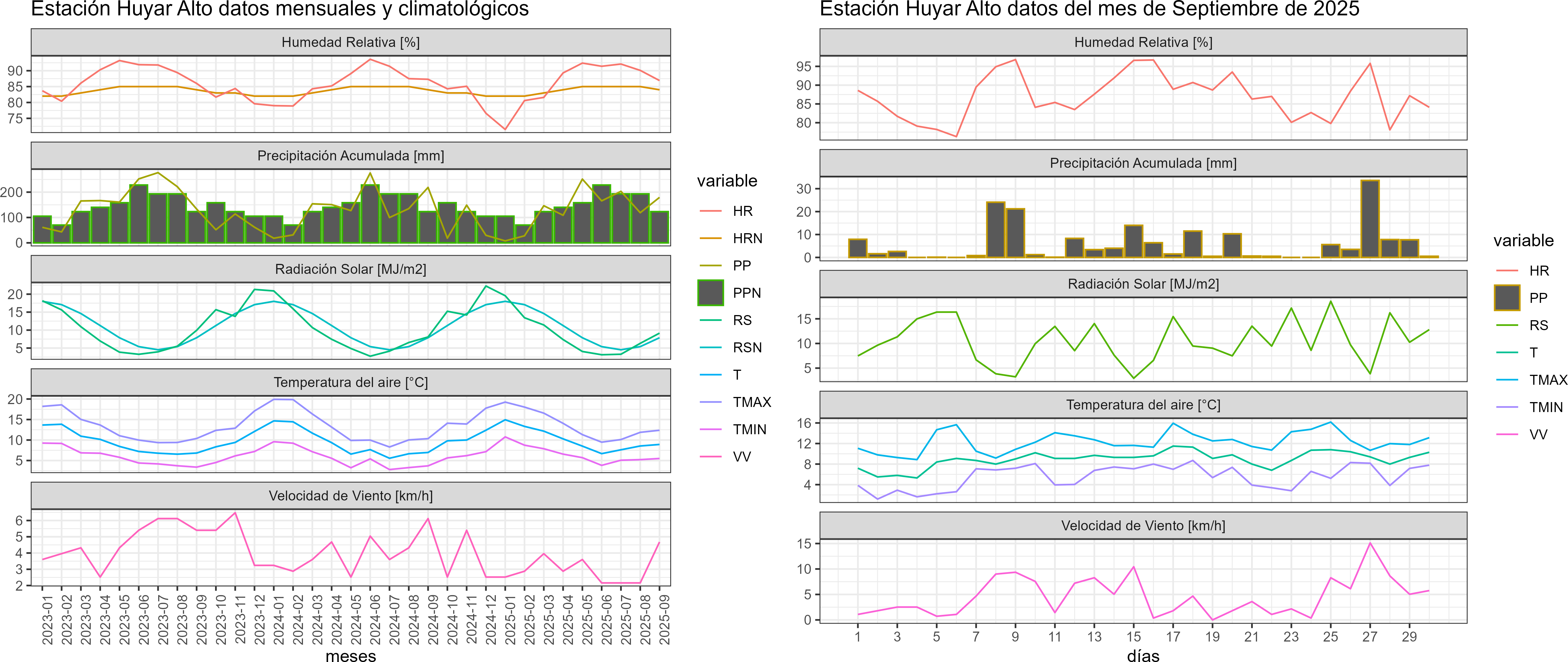 La estación Huyar Alto corresponde al distrito agroclimático 10-4. Para este distrito climático la temperatura mínima, media y máxima climatológicas alcanzan los 4.4°C, 8.1°C y 11.9°C respectivamente. Por su parte, respecto a las temperaturas medidas durante el mes de septiembre en la estación: la temperatura mínima alcanzo los 5.6°C (1.2°C sobre la climatológica), la temperatura media 8.9°C (0.8°C sobre la climatológica) y la temperatura máxima llegó a los 12.3°C (0.4°C sobre la climatológica). En el mes de septiembre se registró una pluviometría de 179.3 mm, lo cual representa un 128.1% con respecto al mismo mes de un año normal. De enero a septiembre se ha registrado un total acumulado de 1208.6 mm, en circunstancias que un año normal registraría a la fecha 1407 mm, lo que representa un déficit de 14.1%. A la misma fecha, durante el año 2024 la precipitación alcanzaba los 218.6 mm.
