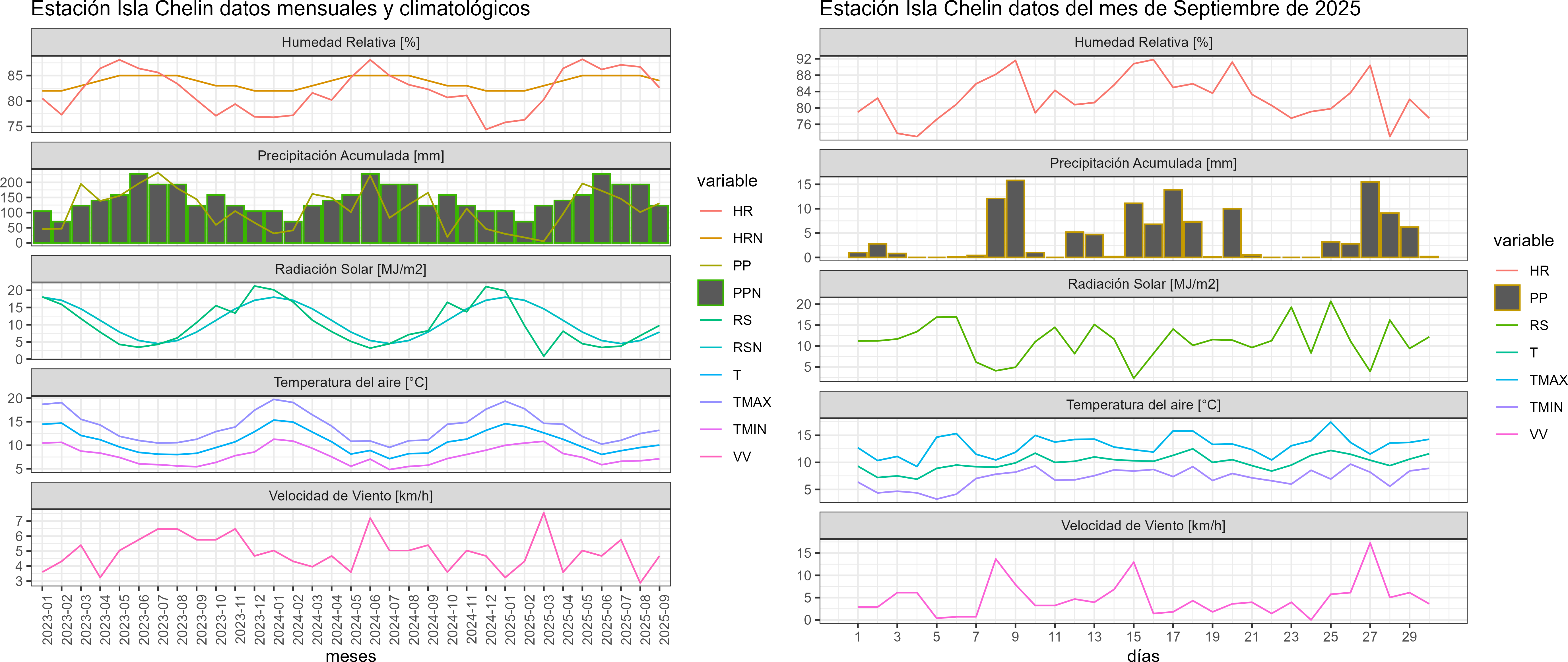 La estación Isla Chelin corresponde al distrito agroclimático 10-4. Para este distrito climático la temperatura mínima, media y máxima climatológicas alcanzan los 5.1°C, 8.5°C y 12°C respectivamente. Por su parte, respecto a las temperaturas medidas durante el mes de septiembre en la estación: la temperatura mínima alcanzo los 7.1°C (2°C sobre la climatológica), la temperatura media 10°C (1.5°C sobre la climatológica) y la temperatura máxima llegó a los 13.1°C (1.1°C sobre la climatológica). En el mes de septiembre se registró una pluviometría de 130.8 mm, lo cual representa un 103% con respecto al mismo mes de un año normal. De enero a septiembre se ha registrado un total acumulado de 895.1 mm, en circunstancias que un año normal registraría a la fecha 1301 mm, lo que representa un déficit de 31.2%. A la misma fecha, durante el año 2024 la precipitación alcanzaba los 165.6 mm.