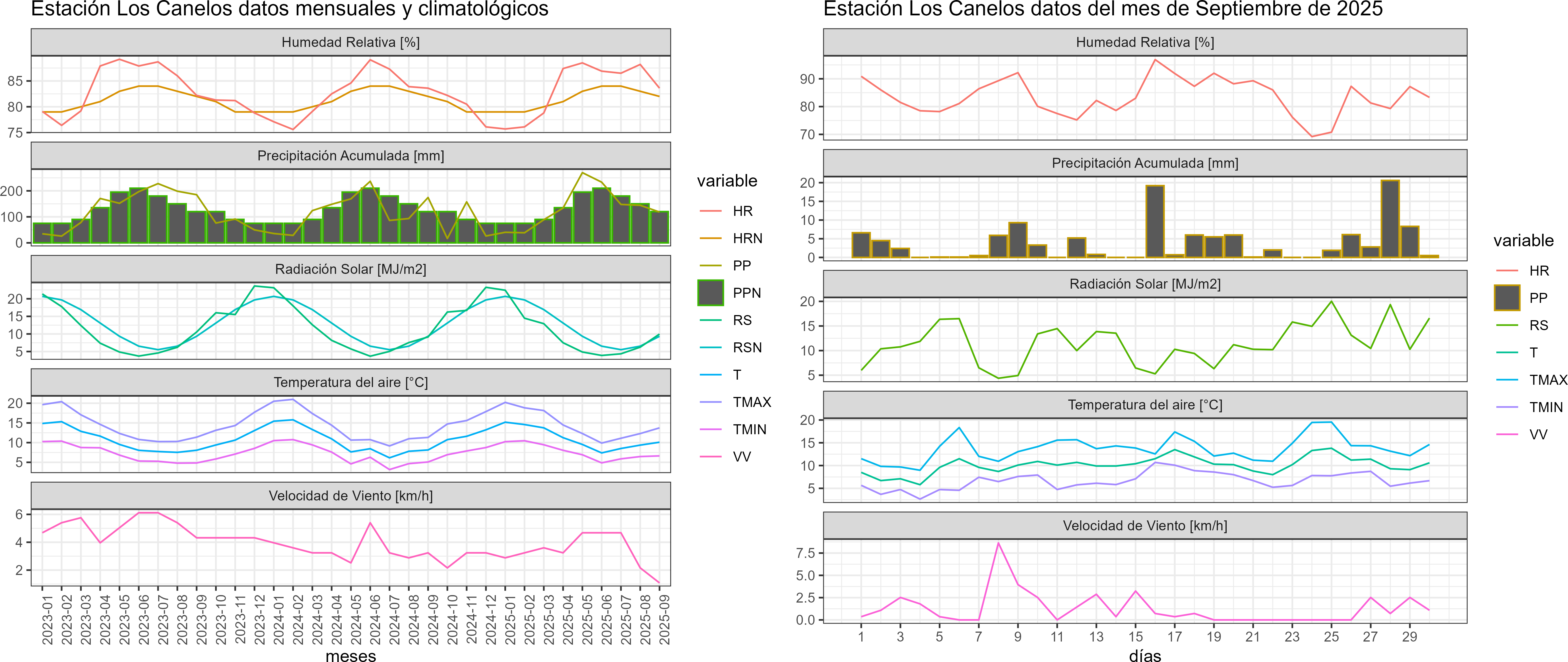 La estación Los Canelos corresponde al distrito agroclimático 14-10-1. Para este distrito climático la temperatura mínima, media y máxima climatológicas alcanzan los 3.8°C, 8.6°C y 13.5°C respectivamente. Por su parte, respecto a las temperaturas medidas durante el mes de septiembre en la estación: la temperatura mínima alcanzo los 6.7°C (2.9°C sobre la climatológica), la temperatura media 10.1°C (1.5°C sobre la climatológica) y la temperatura máxima llegó a los 13.7°C (0.2°C sobre la climatológica). En el mes de septiembre se registró una pluviometría de 118.4 mm, lo cual representa un 94.7% con respecto al mismo mes de un año normal. De enero a septiembre se ha registrado un total acumulado de 1215.7 mm, en circunstancias que un año normal registraría a la fecha 1220 mm, lo que representa un déficit de 0.4%. A la misma fecha, durante el año 2024 la precipitación alcanzaba los 174.4 mm.