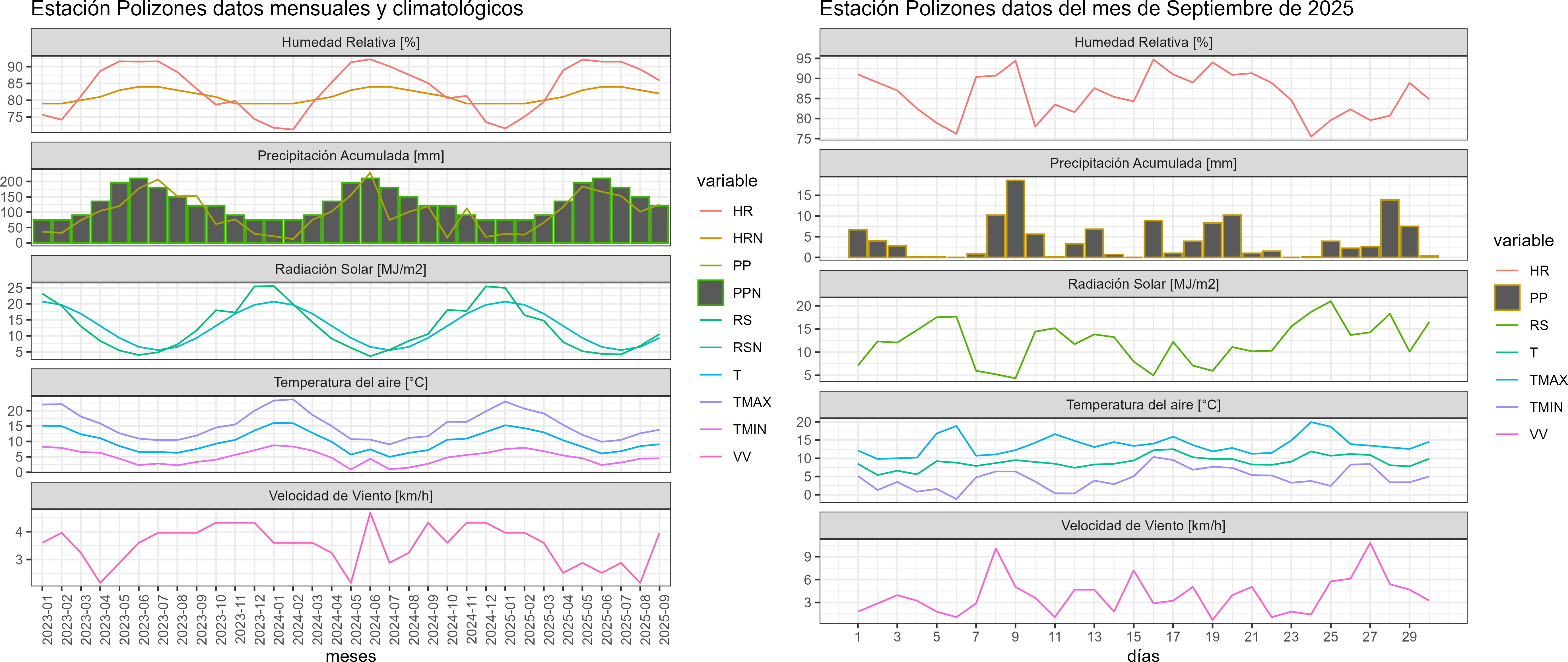 La estación Polizones corresponde al distrito agroclimático 14-10-1. Para este distrito climático la temperatura mínima, media y máxima climatológicas alcanzan los 3.4°C, 8.3°C y 13.2°C respectivamente. Por su parte, respecto a las temperaturas medidas durante el mes de septiembre en la estación: la temperatura mínima alcanzo los 4.5°C (1.1°C sobre la climatológica), la temperatura media 9.1°C (0.8°C sobre la climatológica) y la temperatura máxima llegó a los 13.7°C (0.5°C sobre la climatológica). En el mes de septiembre se registró una pluviometría de 125.1 mm, lo cual representa un 97.7% con respecto al mismo mes de un año normal. De enero a septiembre se ha registrado un total acumulado de 969.6 mm, en circunstancias que un año normal registraría a la fecha 1311 mm, lo que representa un déficit de 26%. A la misma fecha, durante el año 2024 la precipitación alcanzaba los 119.3 mm.