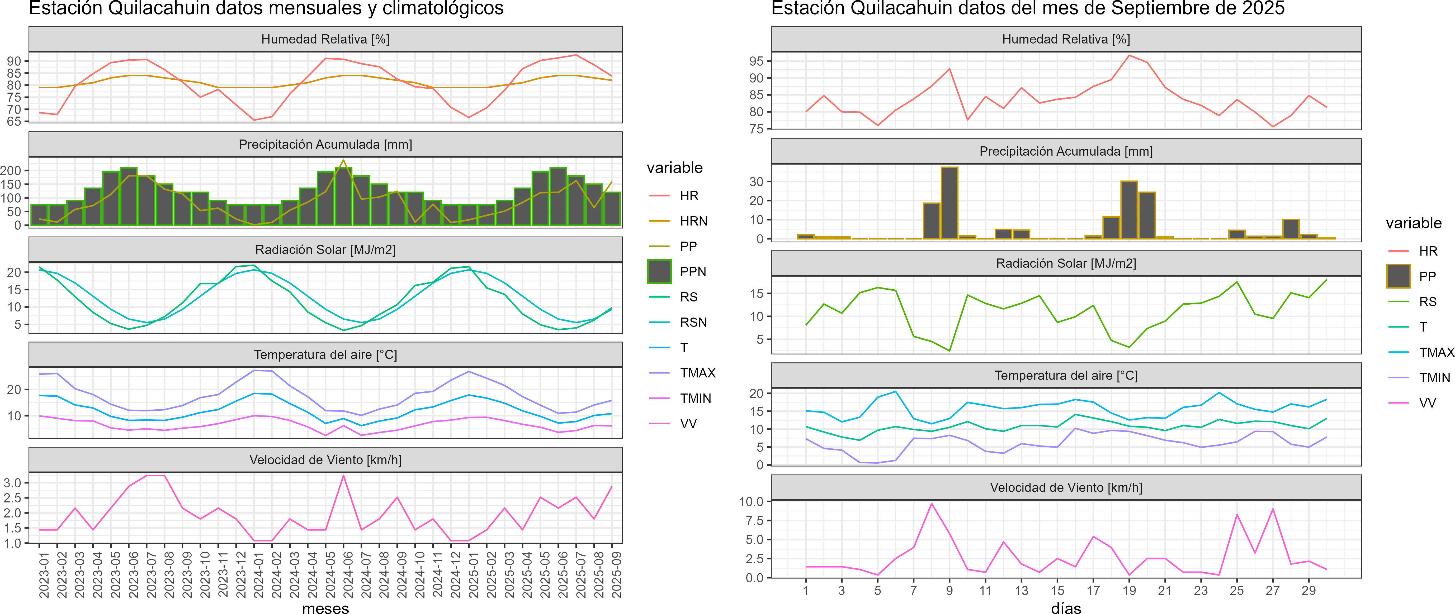 La estación Quilacahuin corresponde al distrito agroclimático 14-10-1. Para este distrito climático la temperatura mínima, media y máxima climatológicas alcanzan los 4.1°C, 9.1°C y 14.1°C respectivamente. Por su parte, respecto a las temperaturas medidas durante el mes de septiembre en la estación: la temperatura mínima alcanzo los 6.2°C (2.1°C sobre la climatológica), la temperatura media 10.8°C (1.7°C sobre la climatológica) y la temperatura máxima llegó a los 15.7°C (1.6°C sobre la climatológica). En el mes de septiembre se registró una pluviometría de 159.5 mm, lo cual representa un 121.8% con respecto al mismo mes de un año normal. De enero a septiembre se ha registrado un total acumulado de 815.8 mm, en circunstancias que un año normal registraría a la fecha 1398 mm, lo que representa un déficit de 41.6%. A la misma fecha, durante el año 2024 la precipitación alcanzaba los 124.2 mm.