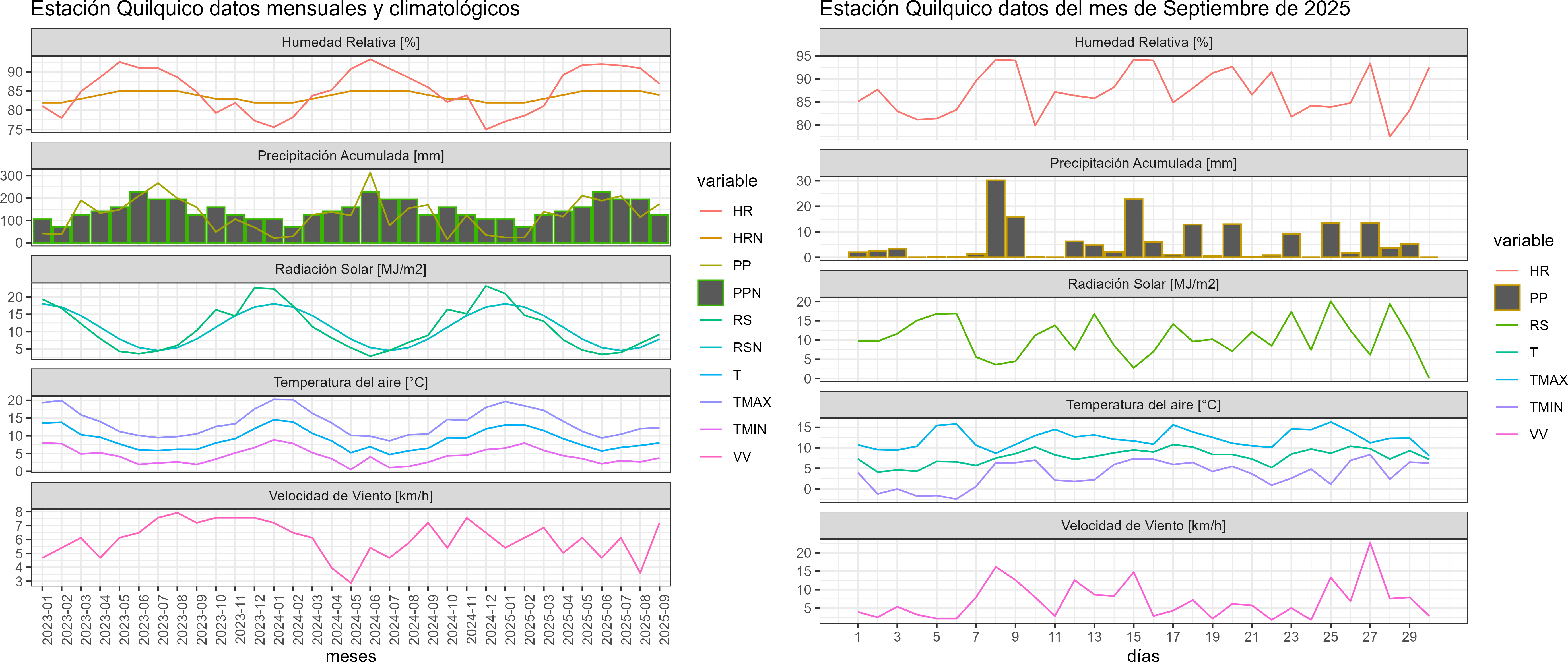 La estación Quilquico corresponde al distrito agroclimático 10-4. Para este distrito climático la temperatura mínima, media y máxima climatológicas alcanzan los 3.8°C, 8.4°C y 13°C respectivamente. Por su parte, respecto a las temperaturas medidas durante el mes de septiembre en la estación: la temperatura mínima alcanzo los 3.7°C (-0.1°C bajo la climatológica), la temperatura media 7.9°C (-0.5°C bajo la climatológica) y la temperatura máxima llegó a los 12.2°C (-0.8°C bajo la climatológica). En el mes de septiembre se registró una pluviometría de 173 mm, lo cual representa un 121% con respecto al mismo mes de un año normal. De enero a septiembre se ha registrado un total acumulado de 1197.8 mm, en circunstancias que un año normal registraría a la fecha 1397 mm, lo que representa un déficit de 14.3%. A la misma fecha, durante el año 2024 la precipitación alcanzaba los 168.6 mm.