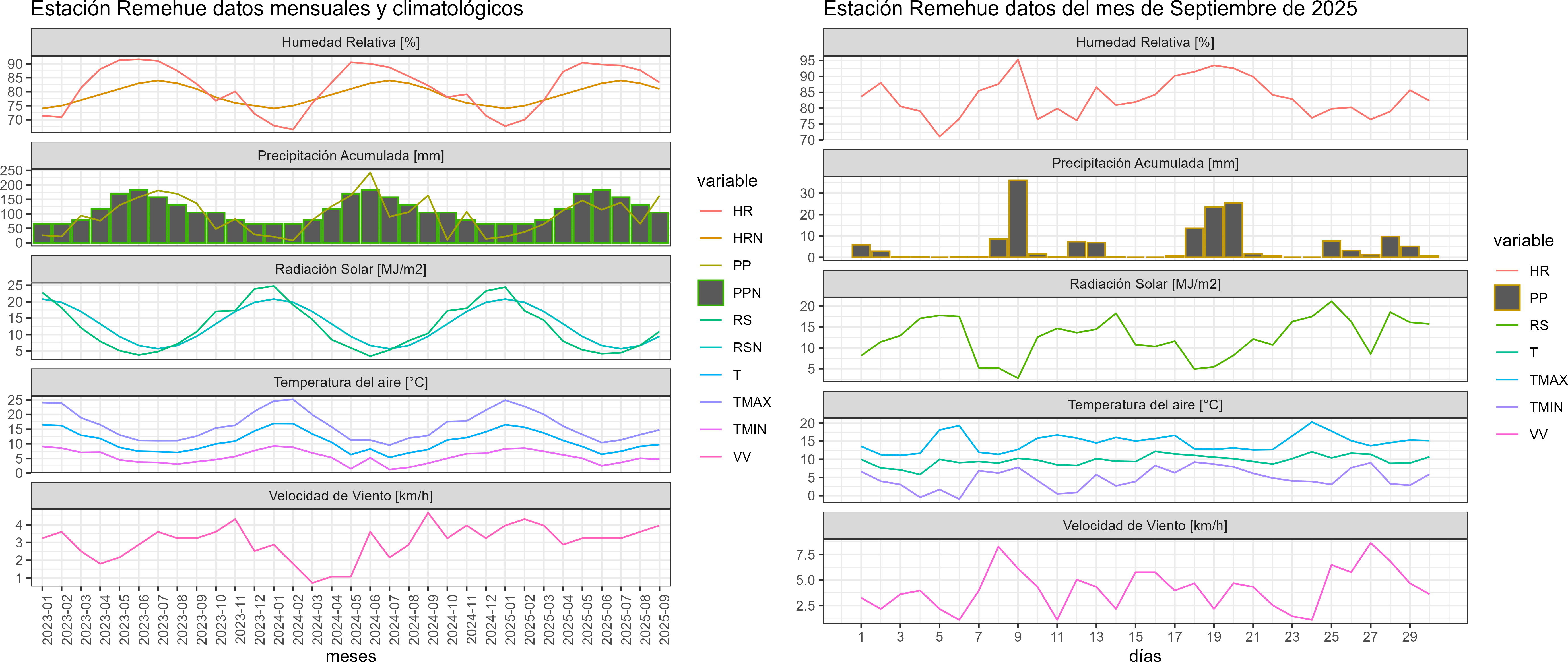 La estación Remehue corresponde al distrito agroclimático 14-10-2. Para este distrito climático la temperatura mínima, media y máxima climatológicas alcanzan los 4.1°C, 9.4°C y 14.6°C respectivamente. Por su parte, respecto a las temperaturas medidas durante el mes de septiembre en la estación: la temperatura mínima alcanzo los 4.8°C (0.7°C sobre la climatológica), la temperatura media 9.7°C (0.3°C sobre la climatológica) y la temperatura máxima llegó a los 14.7°C (0.1°C sobre la climatológica). En el mes de septiembre se registró una pluviometría de 163.2 mm, lo cual representa un 166.5% con respecto al mismo mes de un año normal. De enero a septiembre se ha registrado un total acumulado de 865.4 mm, en circunstancias que un año normal registraría a la fecha 1075 mm, lo que representa un déficit de 19.5%. A la misma fecha, durante el año 2024 la precipitación alcanzaba los 163.7 mm.
