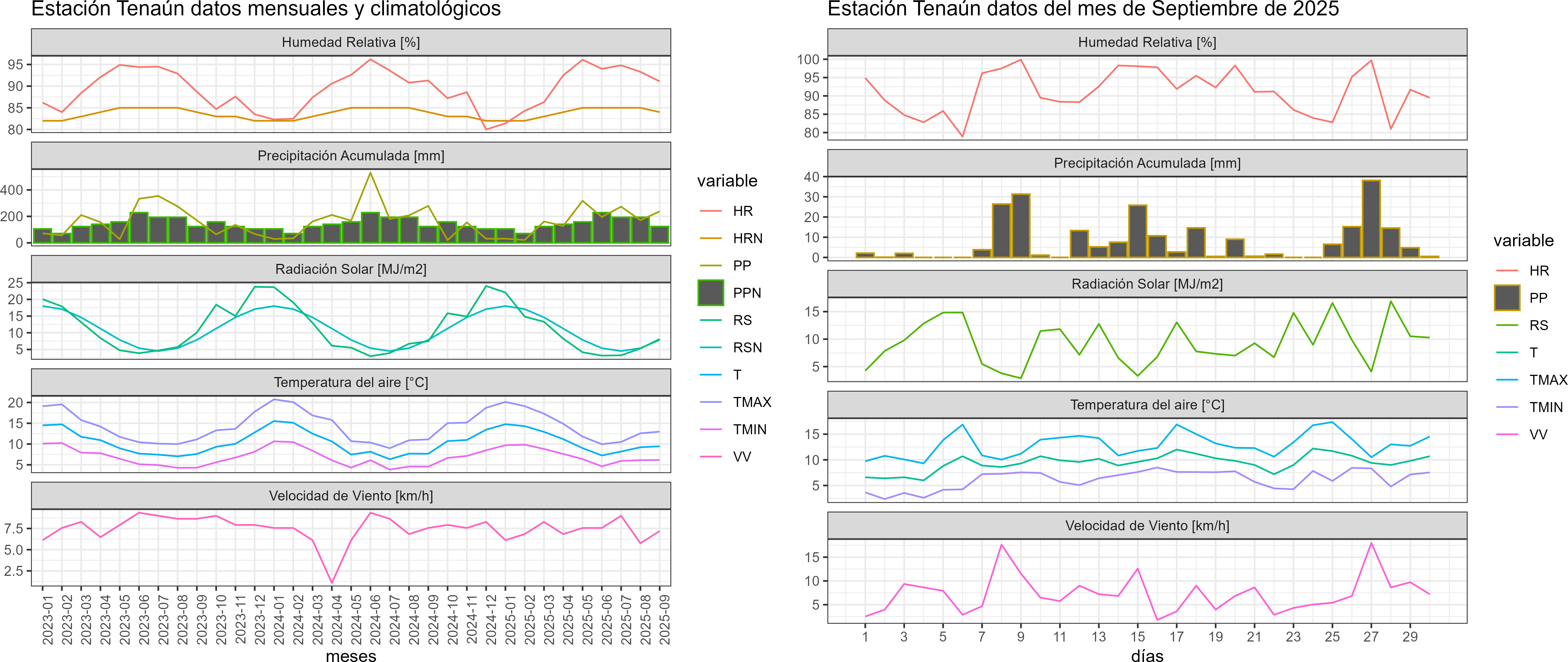 La estación Tenaún corresponde al distrito agroclimático 10-4. Para este distrito climático la temperatura mínima, media y máxima climatológicas alcanzan los 5.1°C, 8.3°C y 11.4°C respectivamente. Por su parte, respecto a las temperaturas medidas durante el mes de septiembre en la estación: la temperatura mínima alcanzo los 6.2°C (1.1°C sobre la climatológica), la temperatura media 9.4°C (1.1°C sobre la climatológica) y la temperatura máxima llegó a los 12.9°C (1.5°C sobre la climatológica). En el mes de septiembre se registró una pluviometría de 237.9 mm, lo cual representa un 157.5% con respecto al mismo mes de un año normal. De enero a septiembre se ha registrado un total acumulado de 1536.7 mm, en circunstancias que un año normal registraría a la fecha 1542 mm, lo que representa un déficit de 0.3%. A la misma fecha, durante el año 2024 la precipitación alcanzaba los 279.1 mm.