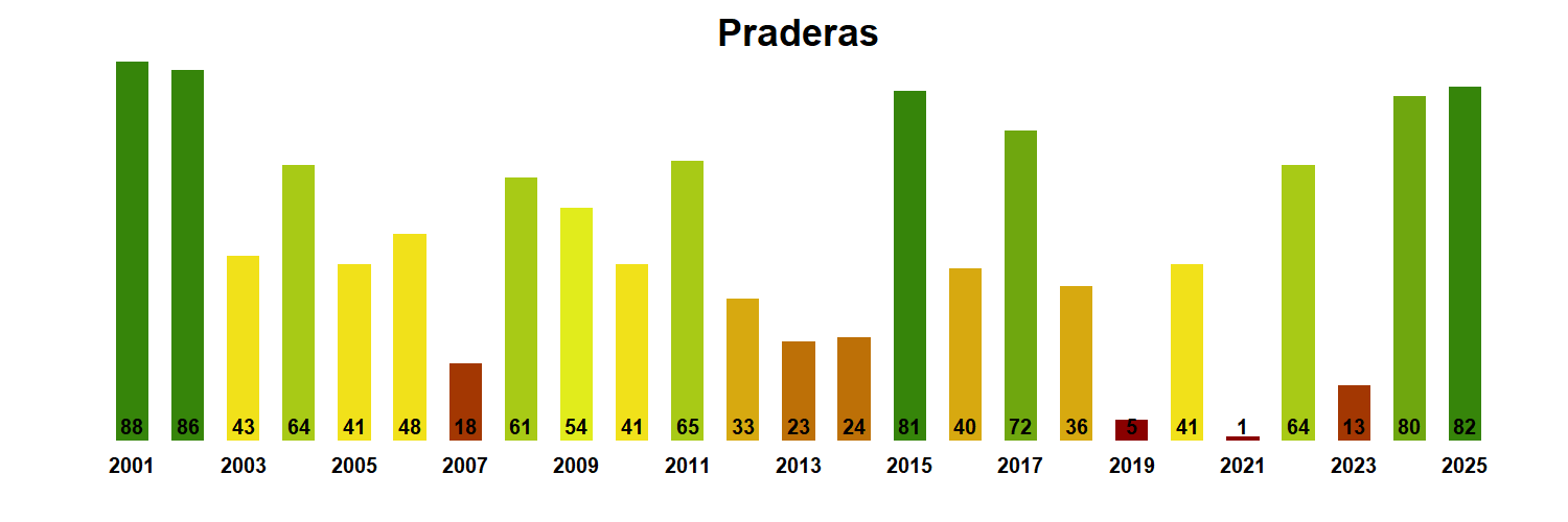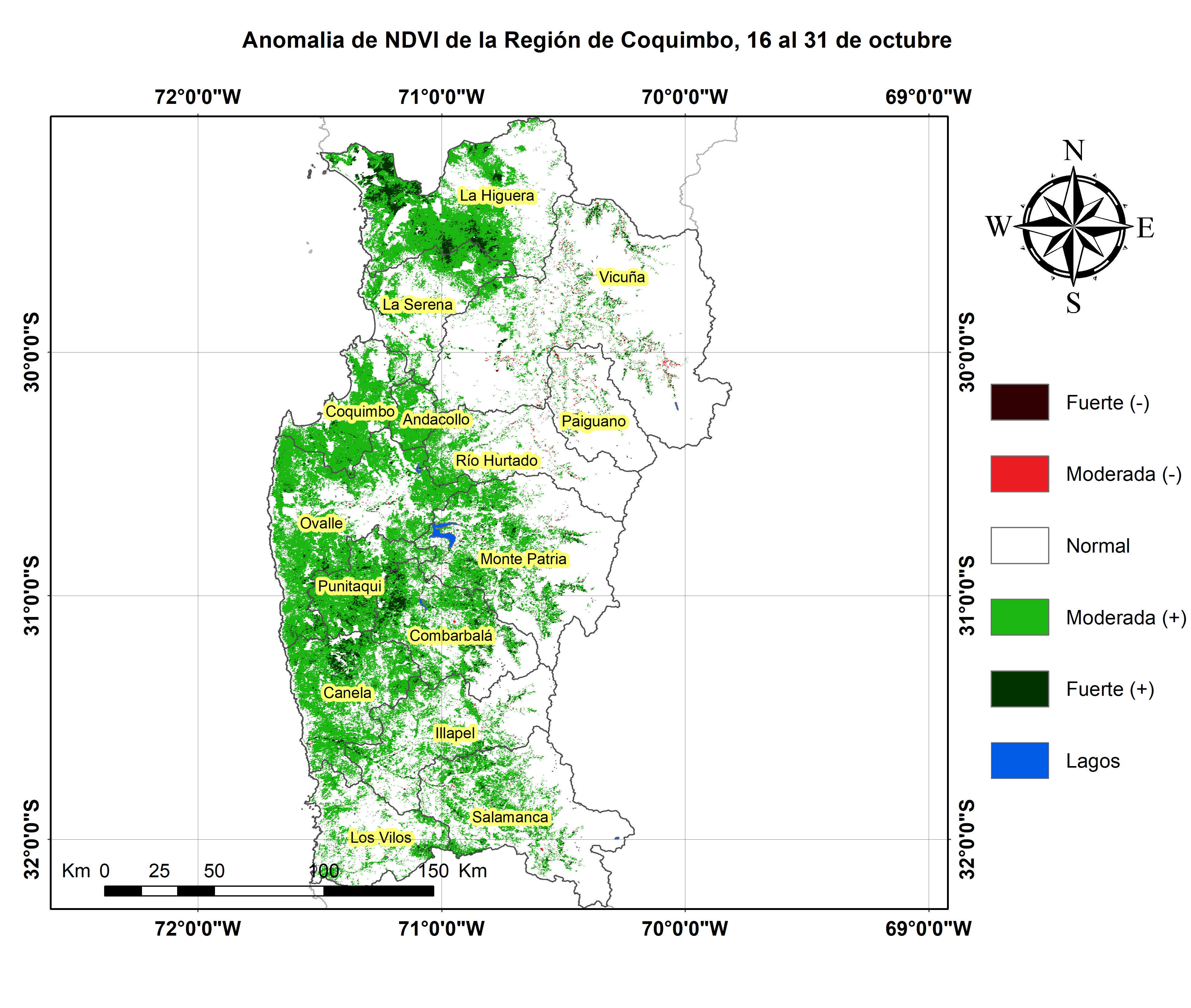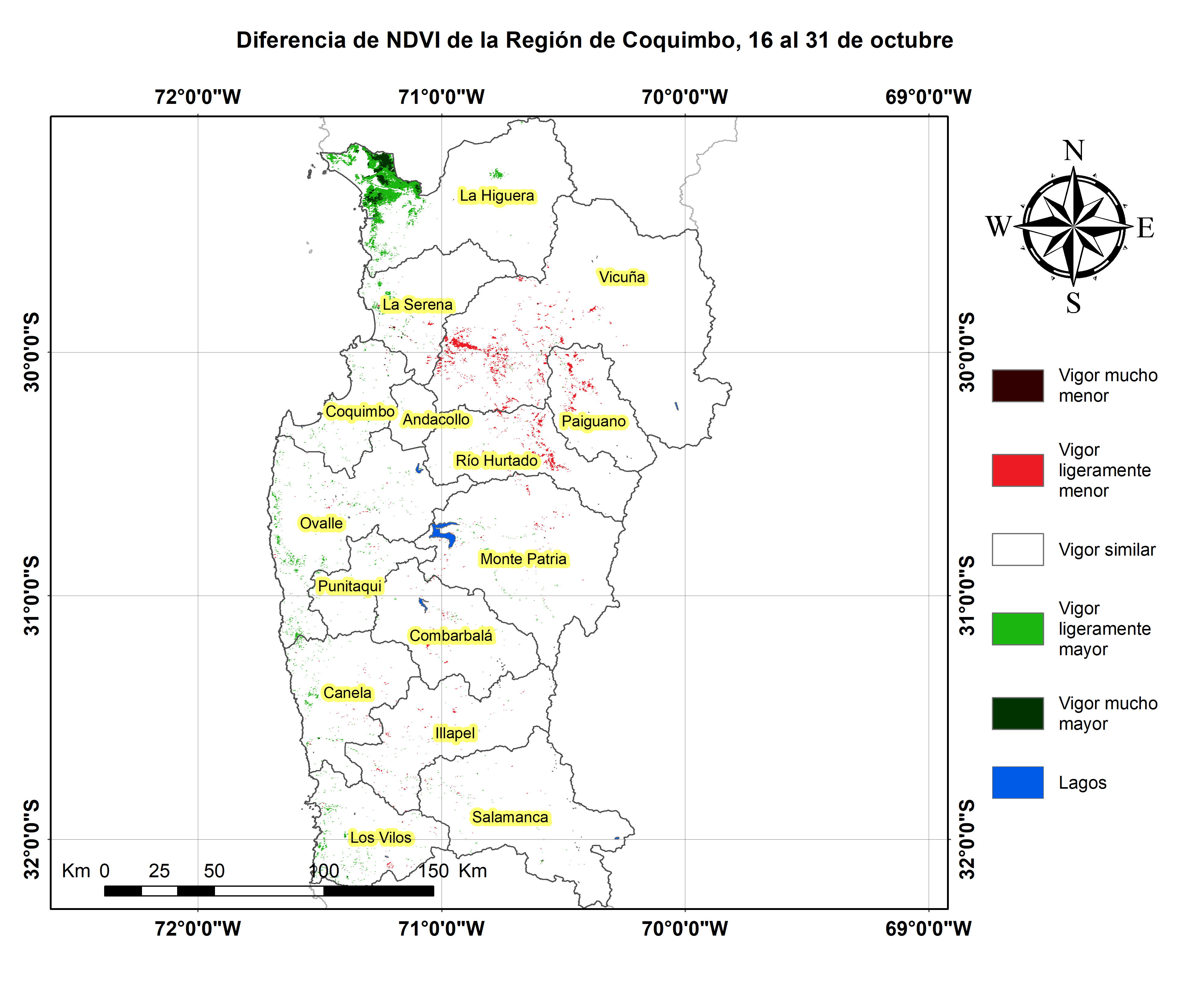 Respecto de la respuesta fisiológica de las plantas al efecto del clima, las imágenes satelitales reflejan la magnitud del crecimiento o disminución de la cobertura vegetal en esta época del año mediante el índice de vegetación NDVI (Desviación Normalizada del Índice de Vegetación).