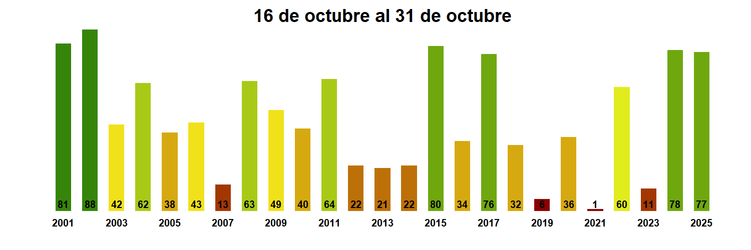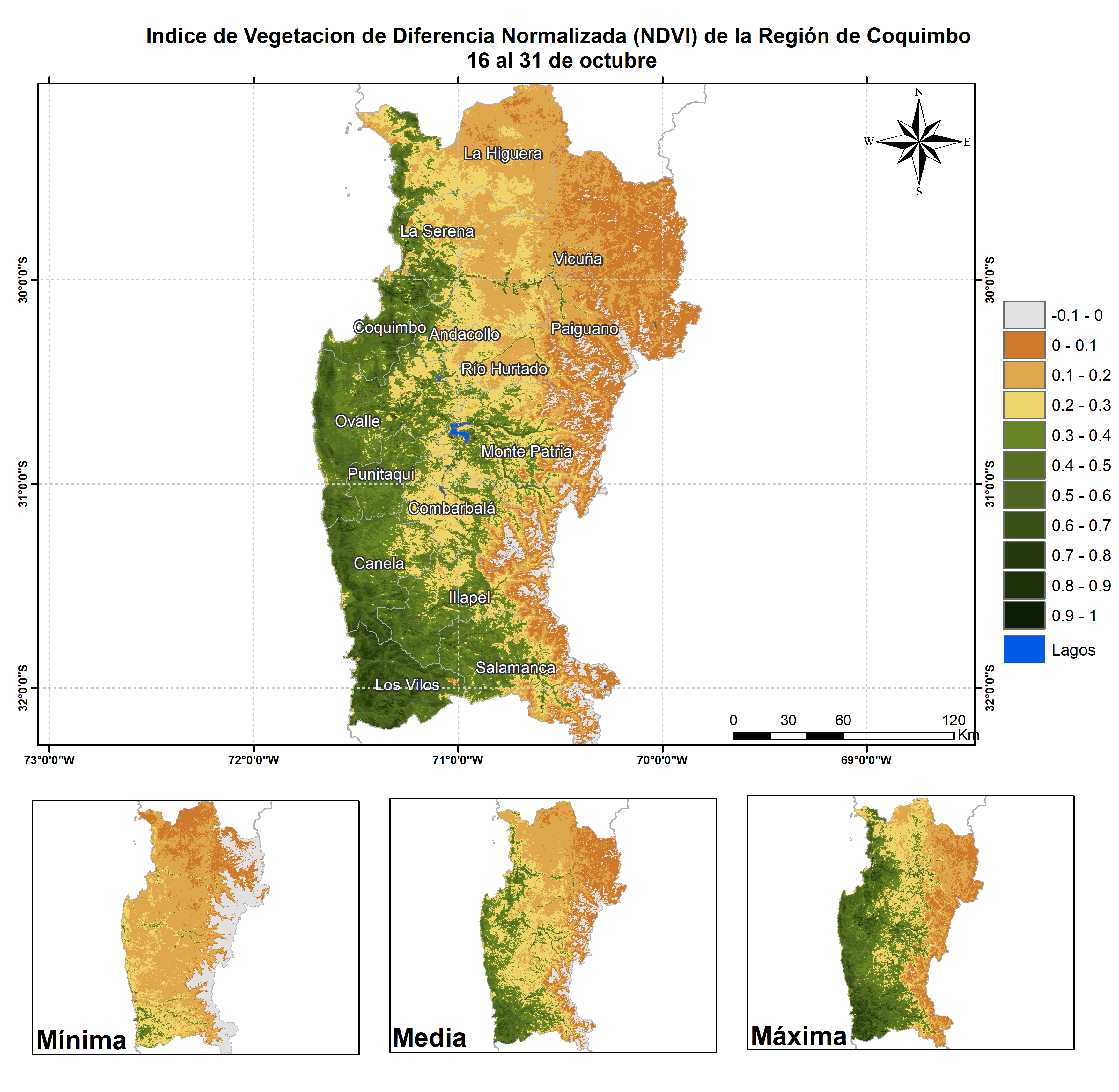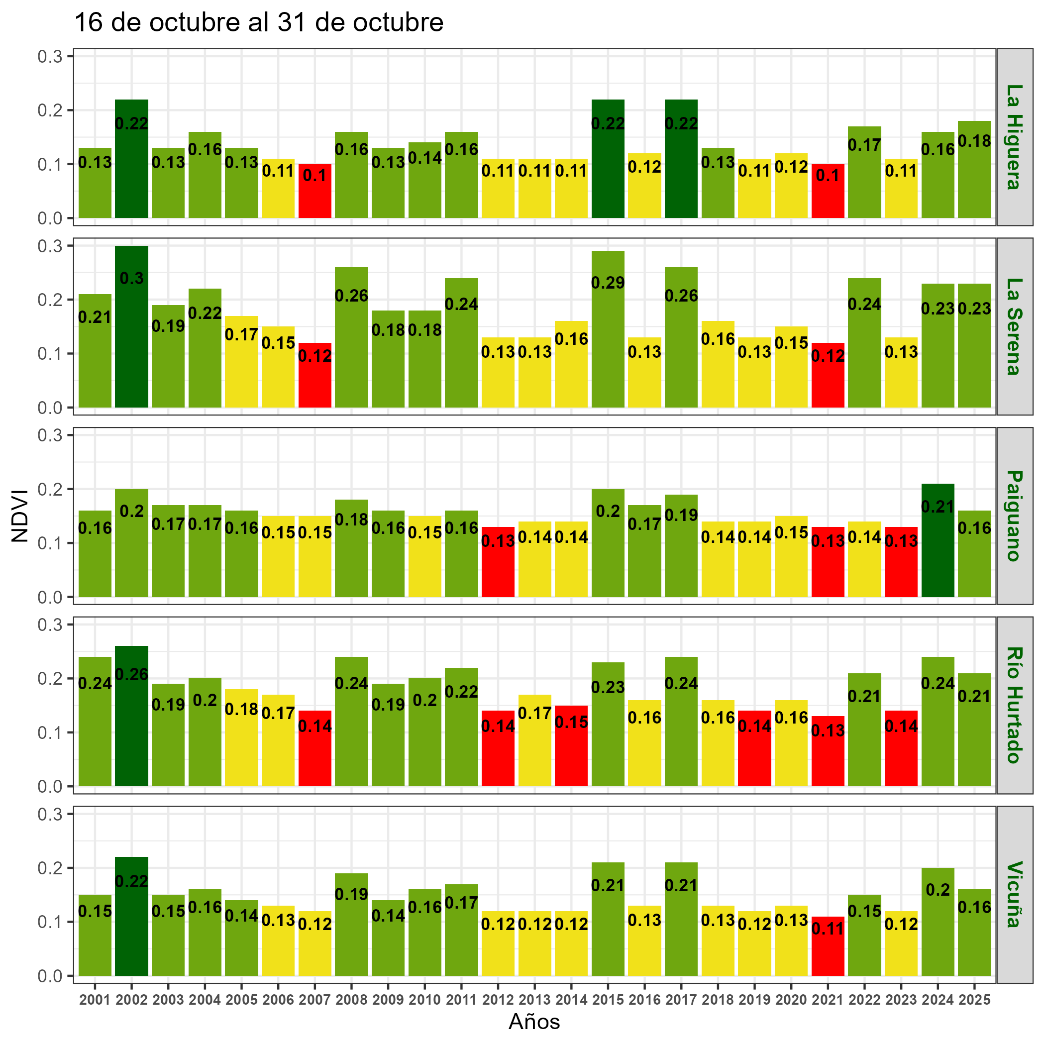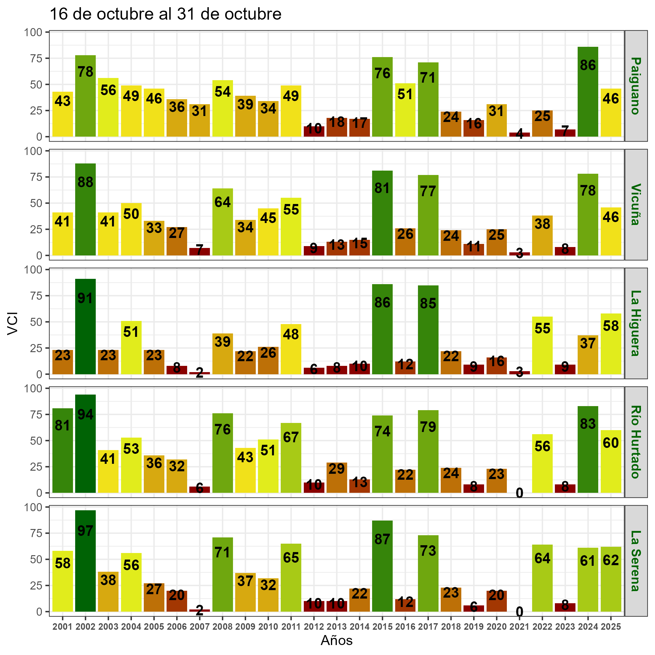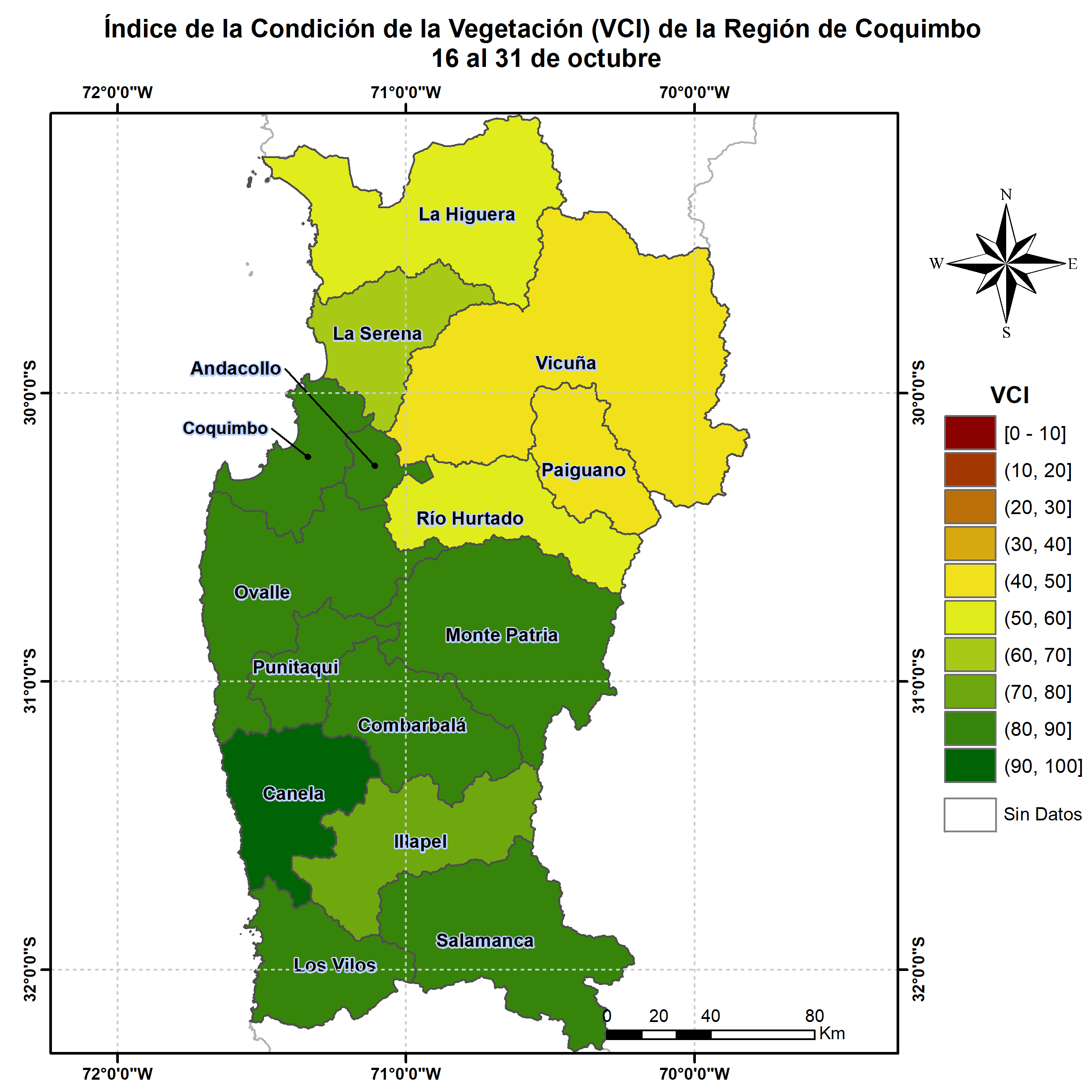 En términos globales la Región presentó un valor mediano de VCI de 77% para el período comprendido desde el 16 al 31 de octubre. A igual período del año pasado presentaba un VCI de 78% (Fig. 1). De acuerdo a la Tabla 1 la Región de Coquimbo, en términos globales presenta una condición Favorable.