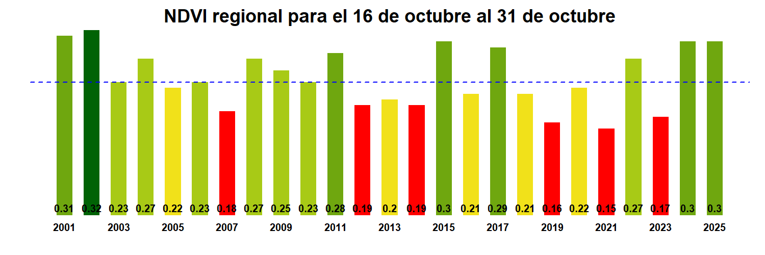 Para esta quincena se observa un NDVI promedio regional de 0.3 mientras el año pasado había sido de 0.3. El valor promedio histórico para esta región, en este período del año es de 0.24.