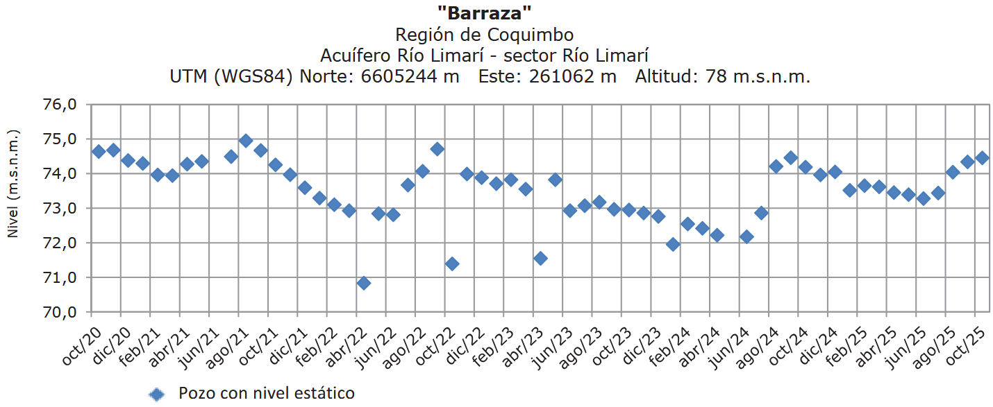 En el pozo Barraza (acuífero Río Limarí, sector Río Limarí), el nivel estático en octubre se situó en torno a 74,5 m.s.n.m., equivalente a aproximadamente 3,5 m desde la superficie. Este valor se ubica levemente por sobre los registros de comienzos de año, confirmando una incipiente recuperación del nivel freático durante 2025.