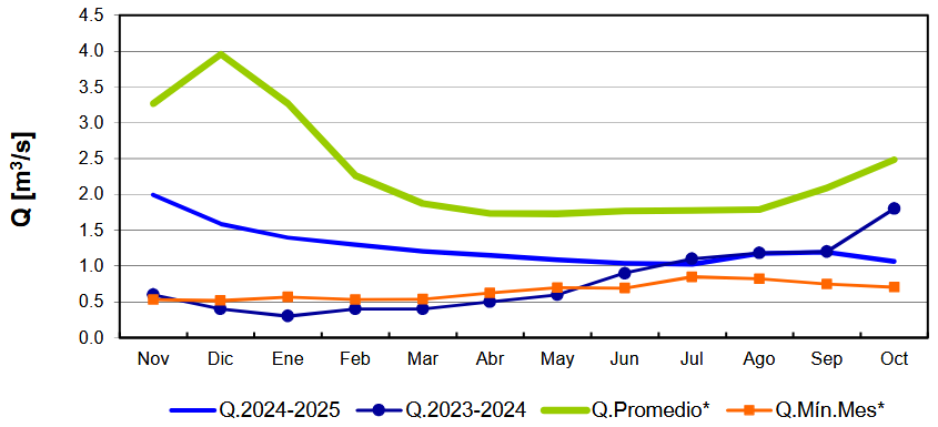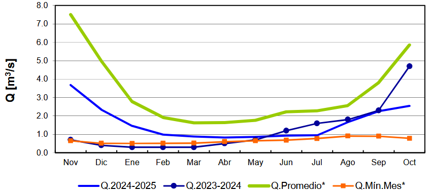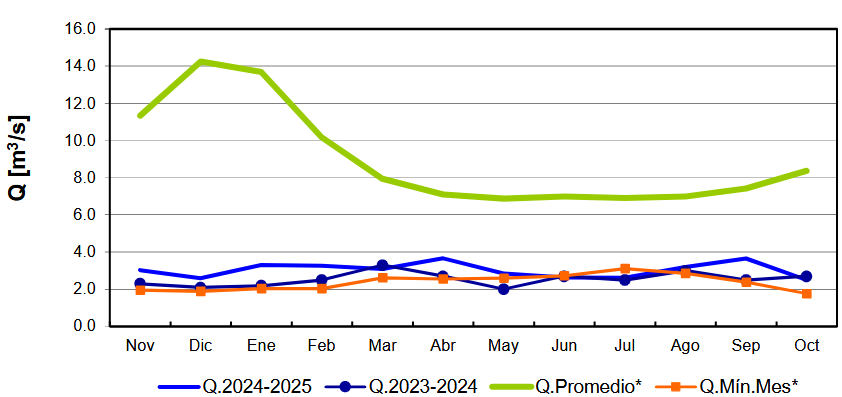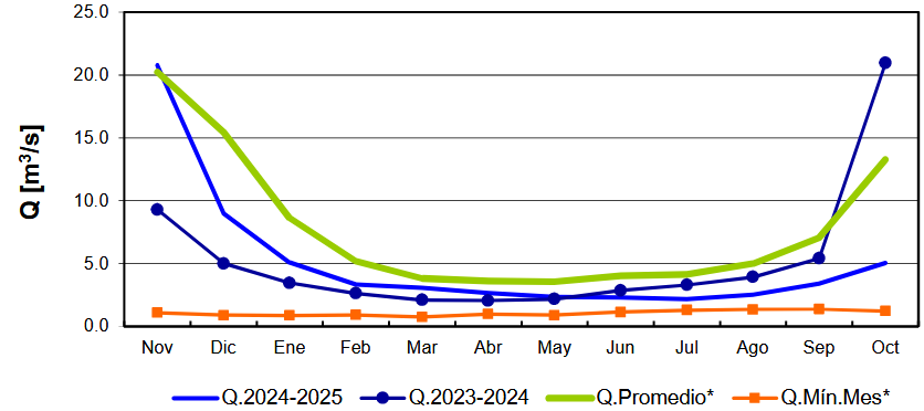 Así, para el período de octubre la estación Río Elqui en Algarrobal registró un caudal de 2,5 m3/s, 70,2% por debajo del promedio histórico (8,4 m3/s), y 7,4% menor que en 2024 (2,7 m3/s). En relación al mes anterior (3,6 m3/s), el caudal disminuyó un 30,6%.