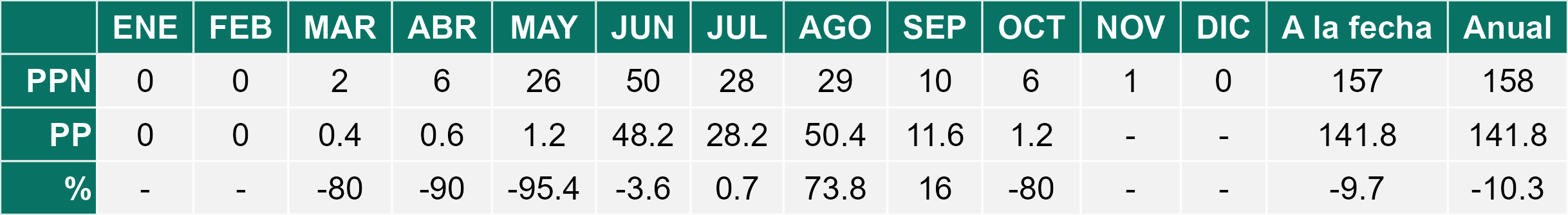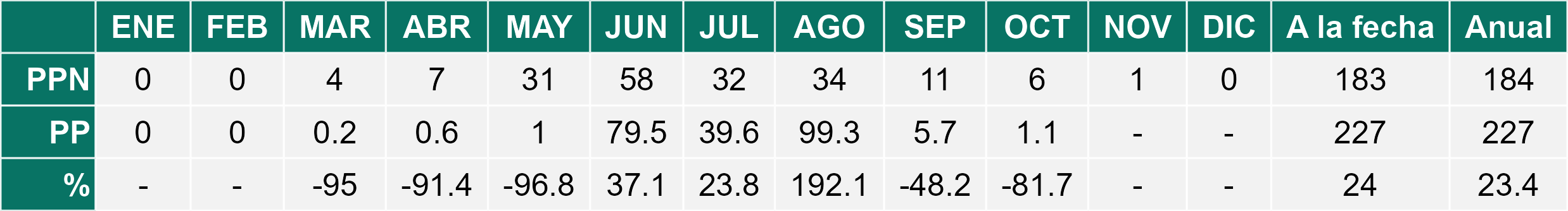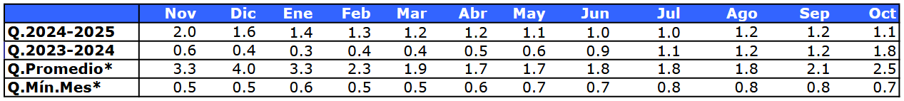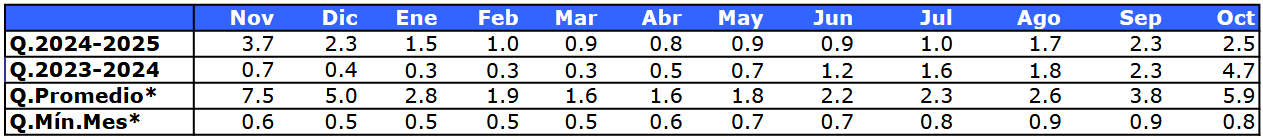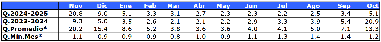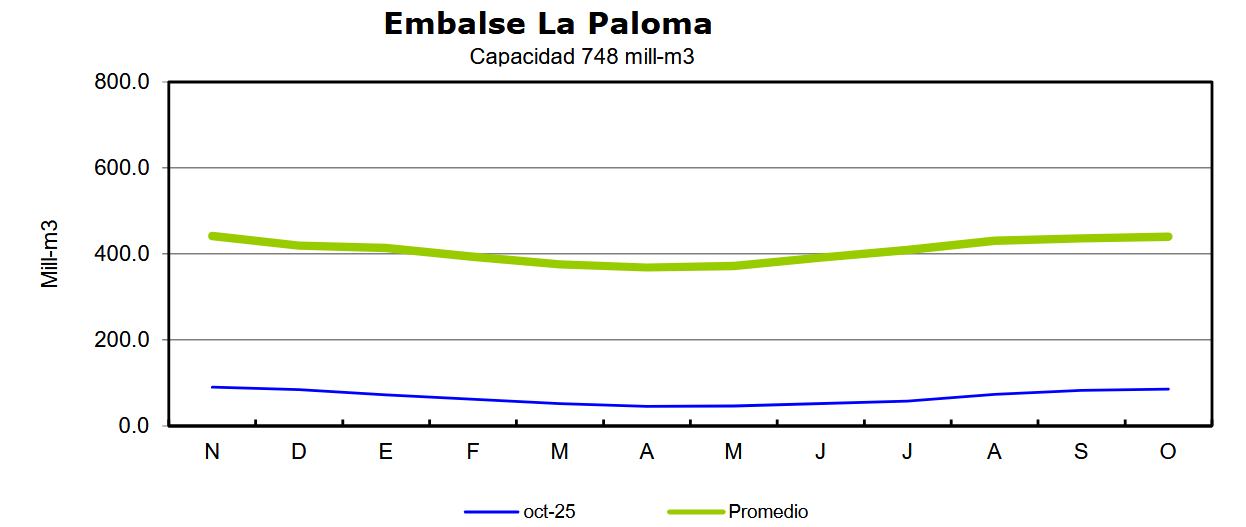Por otro lado, el embalse La Paloma registró al 31 de octubre un volumen de 86,1 millones de m3, lo que representa un aumento de 5,0% respecto al mismo mes de 2024 (82,0 millones de m3). Este valor equivale a cerca del 19% del promedio histórico mensual (441 millones de m3) y corresponde aproximadamente al 11,5% de su capacidad total de almacenamiento (750 millones de m3).