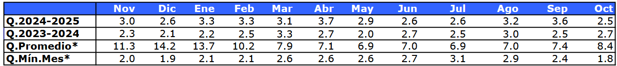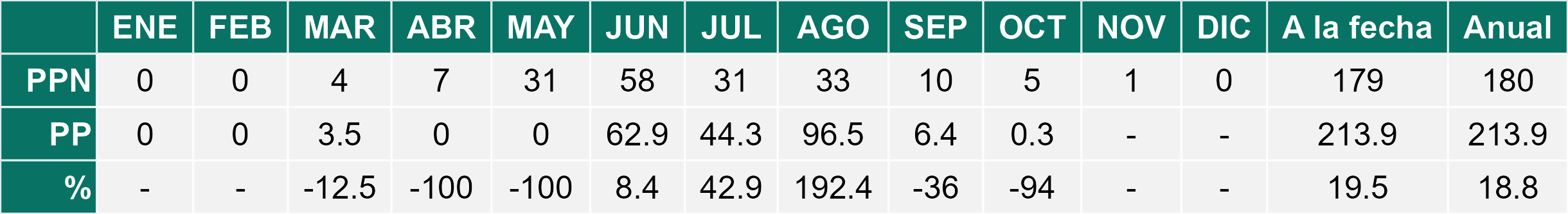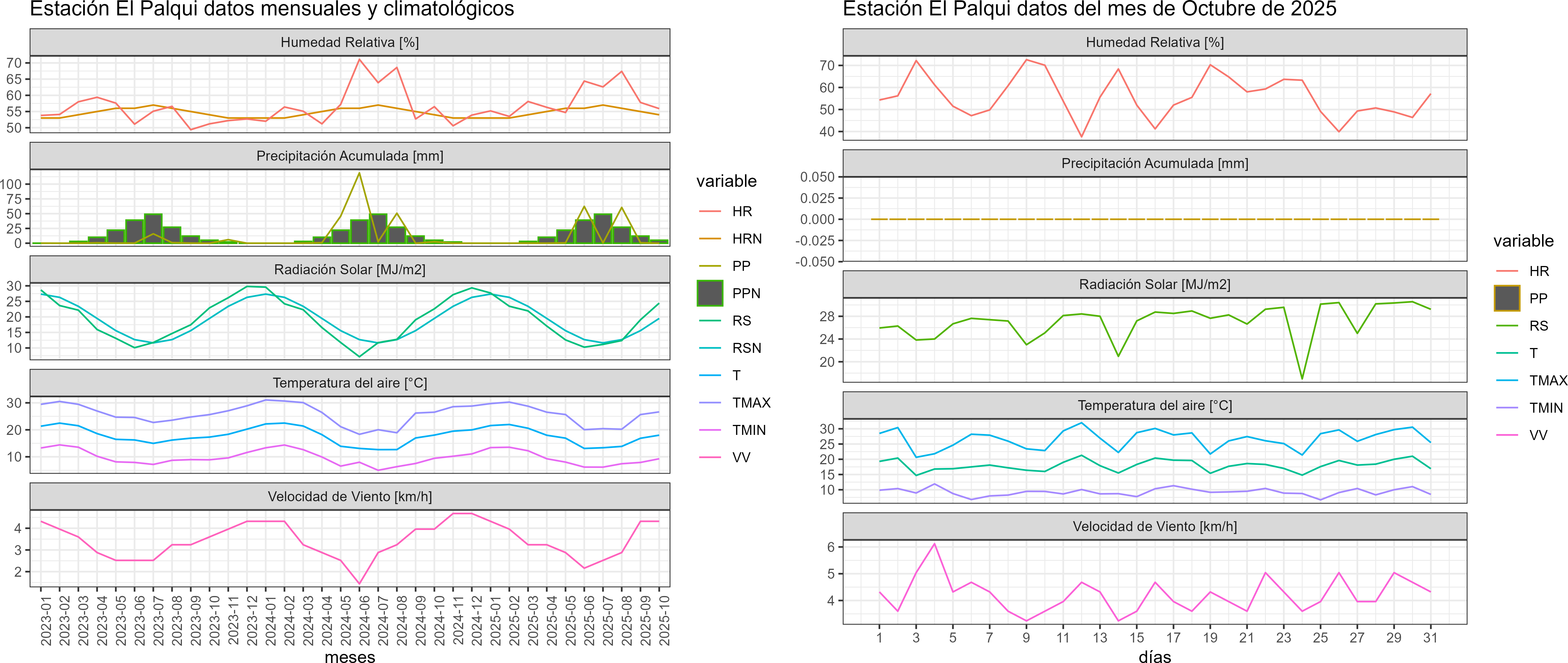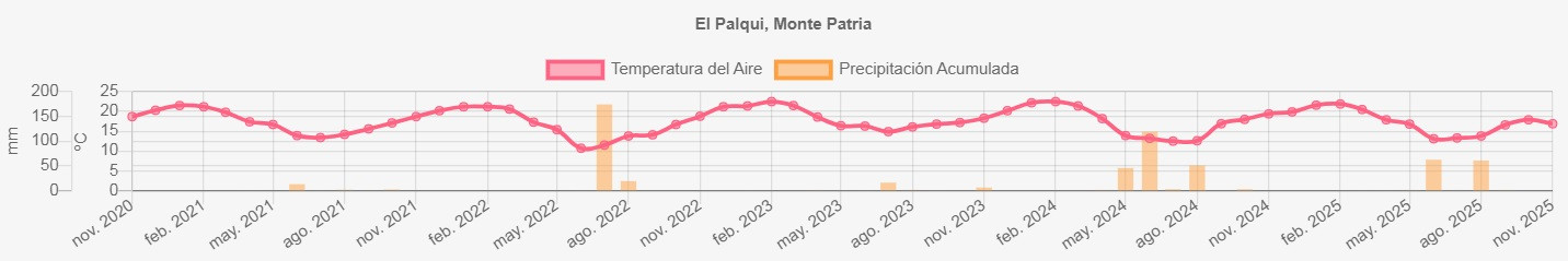 La estación El Palqui corresponde al distrito agroclimático 4-7. Para este distrito climático la temperatura mínima, media y máxima climatológicas alcanzan los 8.8°C, 17.6°C y 26.5°C respectivamente. Por su parte, respecto a las temperaturas medidas durante el mes de octubre en la estación: la temperatura mínima alcanzo los 9.3°C (0.5°C sobre la climatológica), la temperatura media 18°C (0.4°C sobre la climatológica) y la temperatura máxima llegó a los 26.6°C (0.1°C sobre la climatológica). En el mes de octubre se registró una pluviometría de 0 mm, lo cual representa un 0% con respecto al mismo mes de un año normal. De enero a octubre se ha registrado un total acumulado de 125 mm, en circunstancias que un año normal registraría a la fecha 178 mm, lo que representa un déficit de 29.8%. A la misma fecha, durante el año 2024 la precipitación alcanzaba los 2.5 mm.