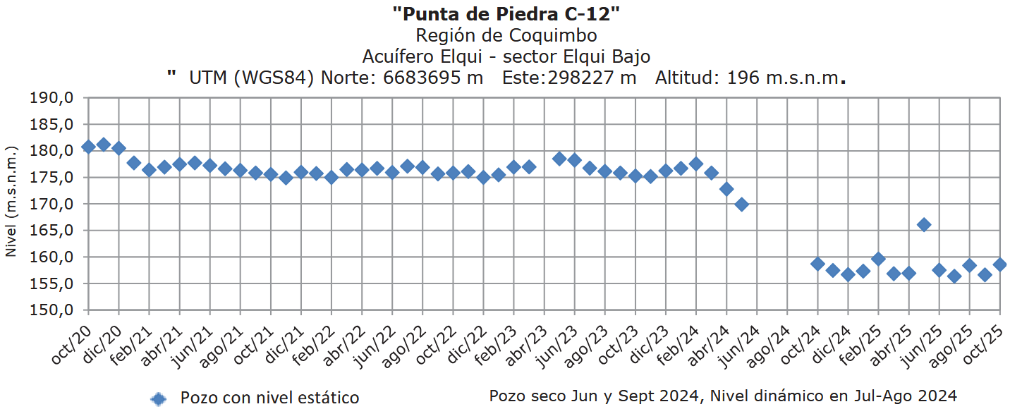 El pozo Punta de Piedra (acuífero Elqui, sector Elqui Bajo) registró en octubre un nivel estático en torno a 158 m.s.n.m., equivalente a unos 38 m desde la superficie, manteniéndose en valores similares a los observados en los meses previos y sin cambios significativos en la tendencia de los últimos meses.