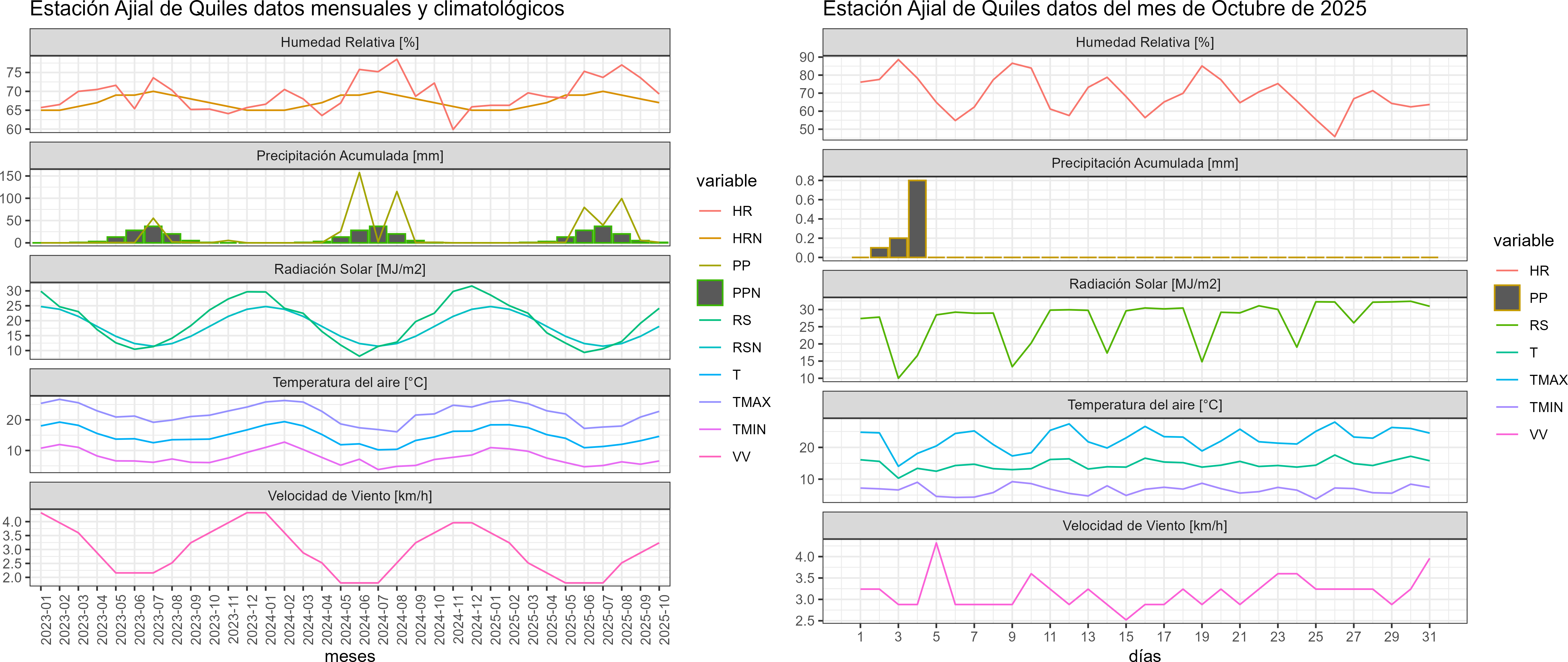 La estación Ajial de Quiles corresponde al distrito agroclimático 3-4-3. Para este distrito climático la temperatura mínima, media y máxima climatológicas alcanzan los 6.8°C, 13.3°C y 19.8°C respectivamente. Por su parte, respecto a las temperaturas medidas durante el mes de octubre en la estación: la temperatura mínima alcanzo los 6.6°C (-0.2°C bajo la climatológica), la temperatura media 14.6°C (1.3°C sobre la climatológica) y la temperatura máxima llegó a los 22.8°C (3°C sobre la climatológica). En el mes de octubre se registró una pluviometría de 1.1 mm, lo cual representa un 18.3% con respecto al mismo mes de un año normal. De enero a octubre se ha registrado un total acumulado de 227 mm, en circunstancias que un año normal registraría a la fecha 183 mm, lo que representa un superávit de 24%. A la misma fecha, durante el año 2024 la precipitación alcanzaba los 1.1 mm.