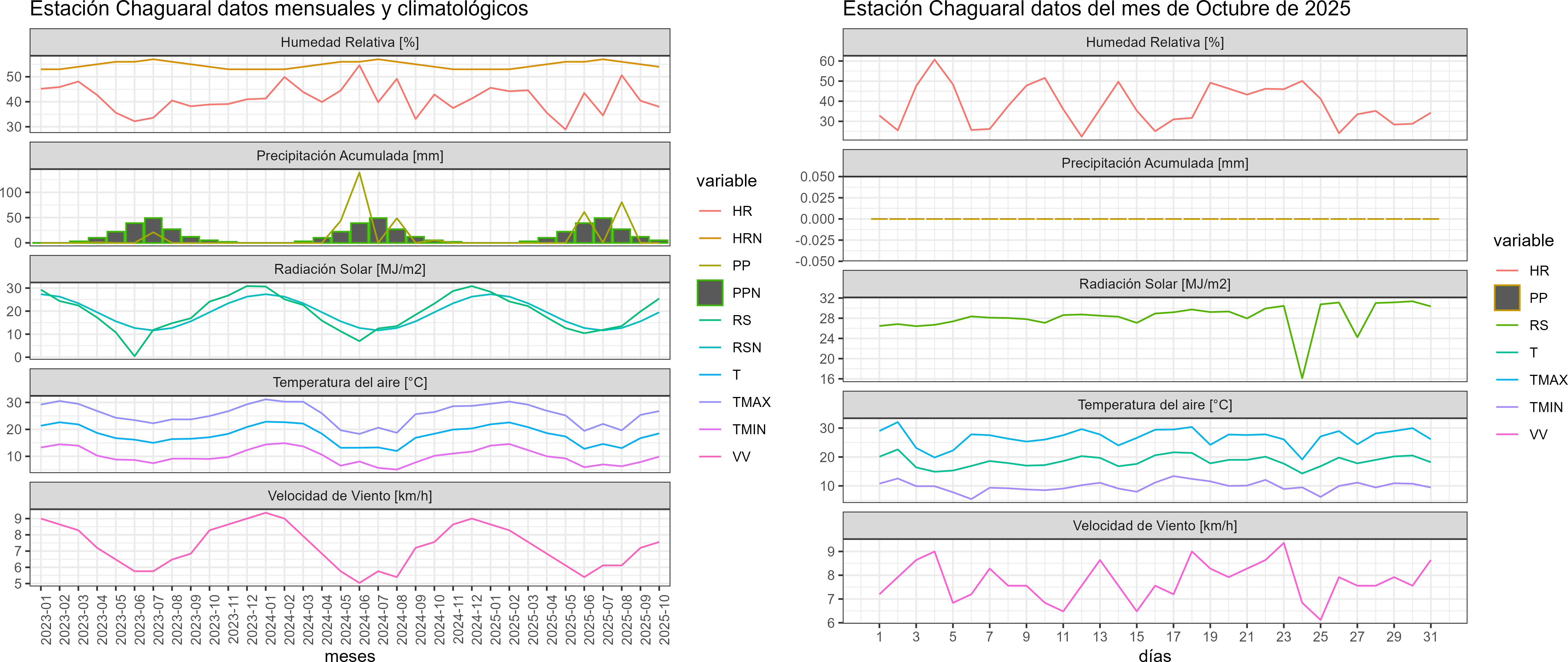 La estación Chaguaral corresponde al distrito agroclimático 4-7. Para este distrito climático la temperatura mínima, media y máxima climatológicas alcanzan los 7.8°C, 15.4°C y 23°C respectivamente. Por su parte, respecto a las temperaturas medidas durante el mes de octubre en la estación: la temperatura mínima alcanzo los 9.9°C (2.1°C sobre la climatológica), la temperatura media 18.5°C (3.1°C sobre la climatológica) y la temperatura máxima llegó a los 26.8°C (3.8°C sobre la climatológica). En el mes de octubre se registró una pluviometría de 0 mm, lo cual representa un 0% con respecto al mismo mes de un año normal. De enero a octubre se ha registrado un total acumulado de 141.9 mm, en circunstancias que un año normal registraría a la fecha 233 mm, lo que representa un déficit de 39.1%. A la misma fecha, durante el año 2024 la precipitación alcanzaba los 5.2 mm.