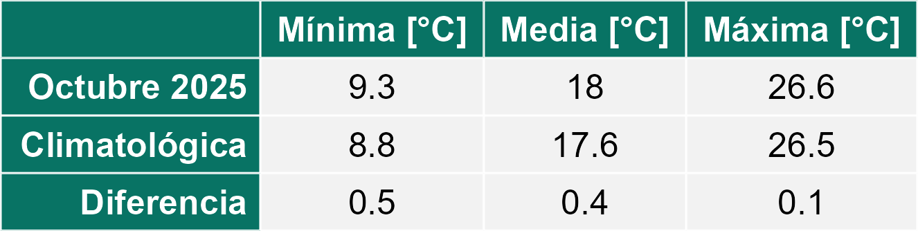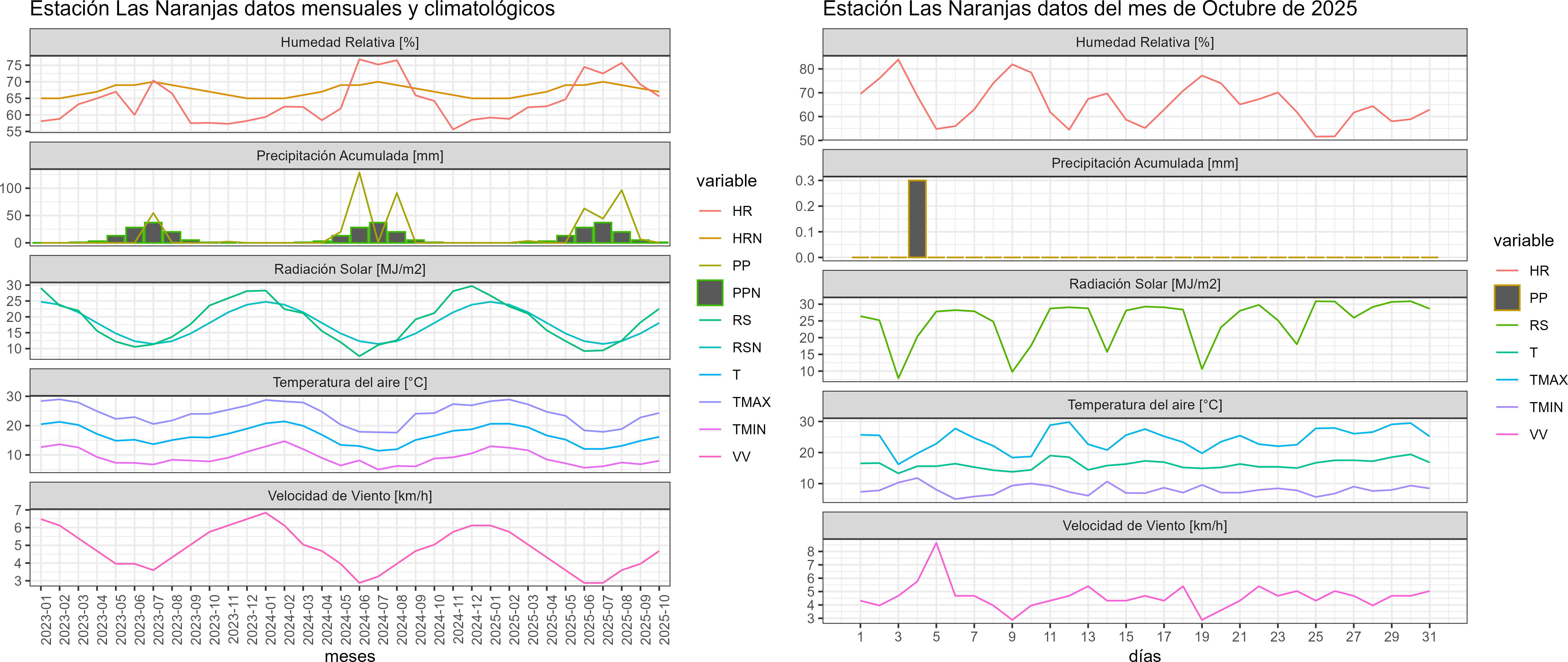 La estación Las Naranjas corresponde al distrito agroclimático 3-4-3. Para este distrito climático la temperatura mínima, media y máxima climatológicas alcanzan los 6.8°C, 13.2°C y 19.6°C respectivamente. Por su parte, respecto a las temperaturas medidas durante el mes de octubre en la estación: la temperatura mínima alcanzo los 8°C (1.2°C sobre la climatológica), la temperatura media 16.2°C (3°C sobre la climatológica) y la temperatura máxima llegó a los 24.3°C (4.7°C sobre la climatológica). En el mes de octubre se registró una pluviometría de 0.3 mm, lo cual representa un 6% con respecto al mismo mes de un año normal. De enero a octubre se ha registrado un total acumulado de 213.9 mm, en circunstancias que un año normal registraría a la fecha 179 mm, lo que representa un superávit de 19.5%. A la misma fecha, durante el año 2024 la precipitación alcanzaba los 0.3 mm.