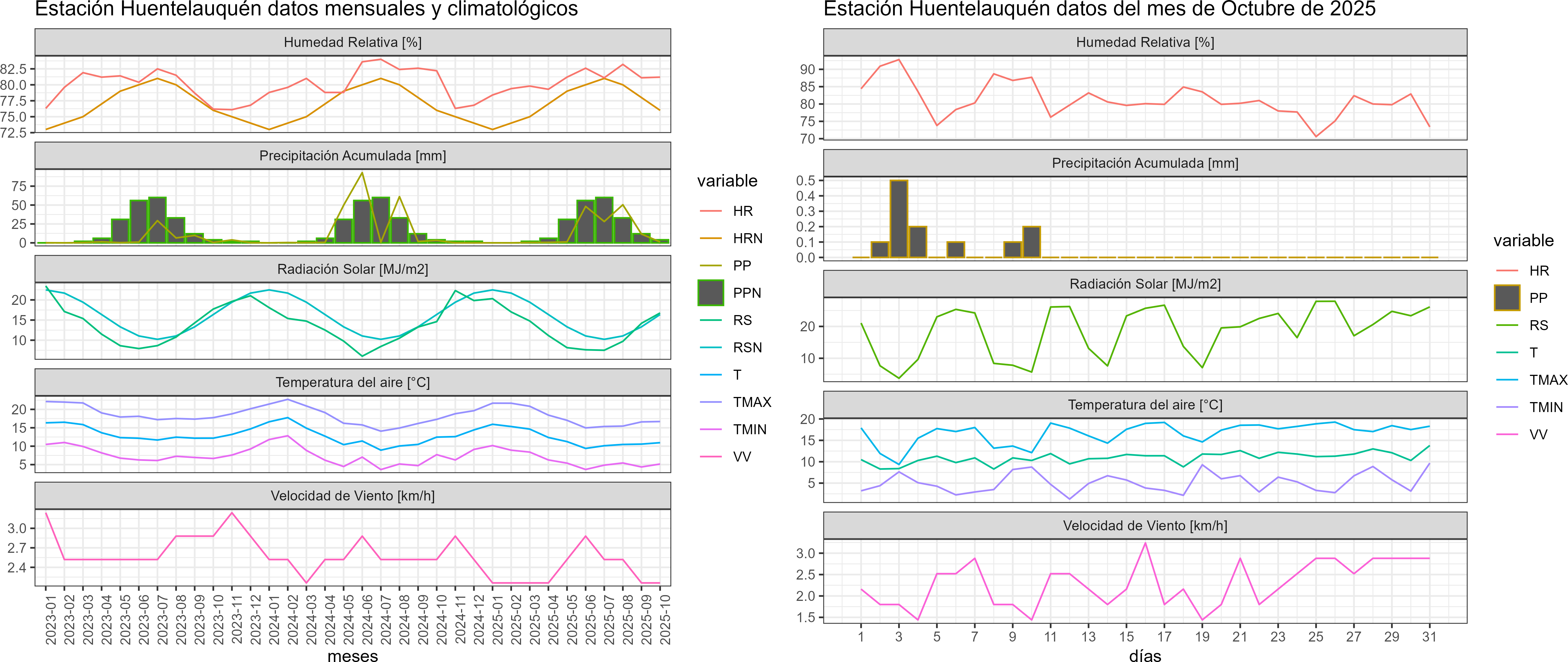 La estación Huentelauquén corresponde al distrito agroclimático 4-1. Para este distrito climático la temperatura mínima, media y máxima climatológicas alcanzan los 8.6°C, 13.2°C y 17.9°C respectivamente. Por su parte, respecto a las temperaturas medidas durante el mes de octubre en la estación: la temperatura mínima alcanzo los 5.2°C (-3.4°C bajo la climatológica), la temperatura media 11°C (-2.2°C bajo la climatológica) y la temperatura máxima llegó a los 16.7°C (-1.2°C bajo la climatológica). En el mes de octubre se registró una pluviometría de 1.2 mm, lo cual representa un 20% con respecto al mismo mes de un año normal. De enero a octubre se ha registrado un total acumulado de 141.8 mm, en circunstancias que un año normal registraría a la fecha 157 mm, lo que representa un déficit de 9.7%. A la misma fecha, durante el año 2024 la precipitación alcanzaba los 3.2 mm.