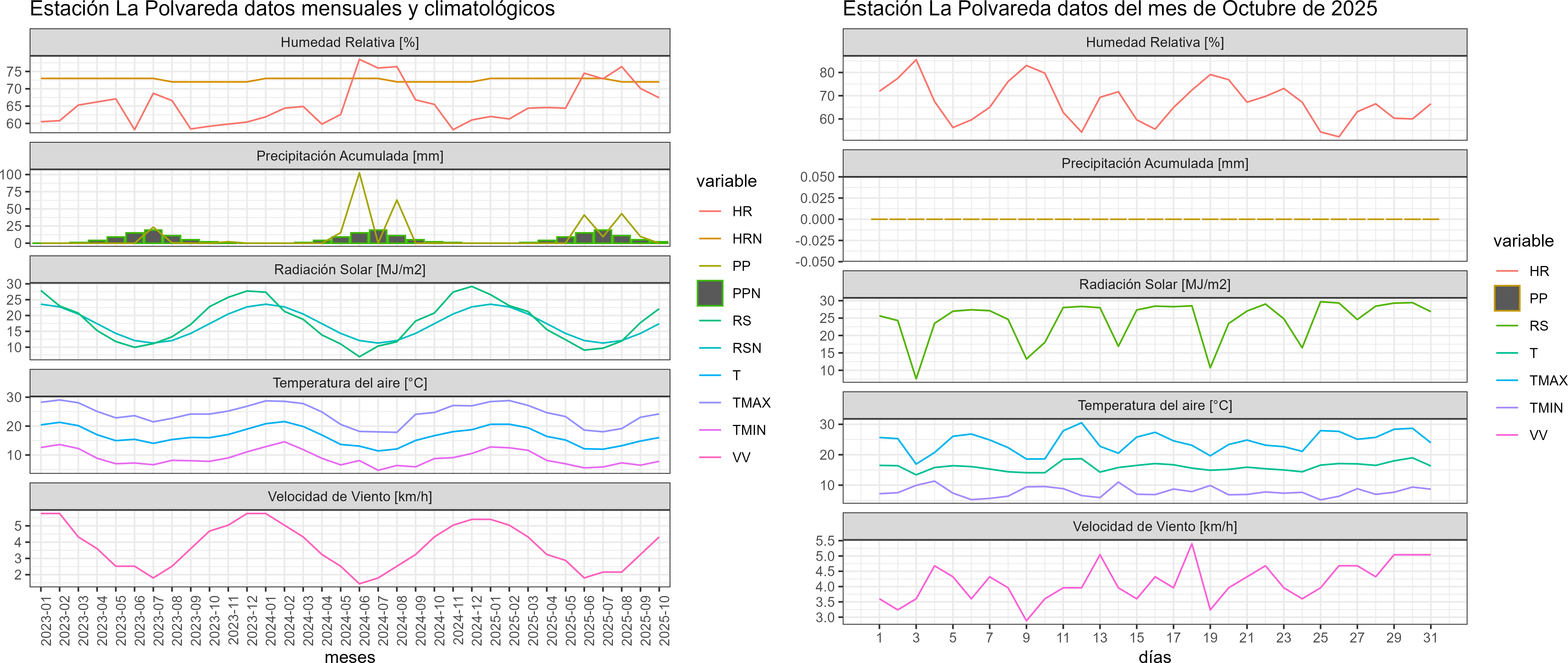 La estación La Polvareda corresponde al distrito agroclimático 3-4-2. Para este distrito climático la temperatura mínima, media y máxima climatológicas alcanzan los 7.4°C, 15.5°C y 23.7°C respectivamente. Por su parte, respecto a las temperaturas medidas durante el mes de octubre en la estación: la temperatura mínima alcanzo los 7.8°C (0.4°C sobre la climatológica), la temperatura media 16°C (0.5°C sobre la climatológica) y la temperatura máxima llegó a los 24.2°C (0.5°C sobre la climatológica). En el mes de octubre se registró una pluviometría de 0 mm, lo cual representa un 0% con respecto al mismo mes de un año normal. De enero a octubre se ha registrado un total acumulado de 103.3 mm, en circunstancias que un año normal registraría a la fecha 165 mm, lo que representa un déficit de 37.4%. A la misma fecha, durante el año 2024 la precipitación alcanzaba los 0.4 mm.