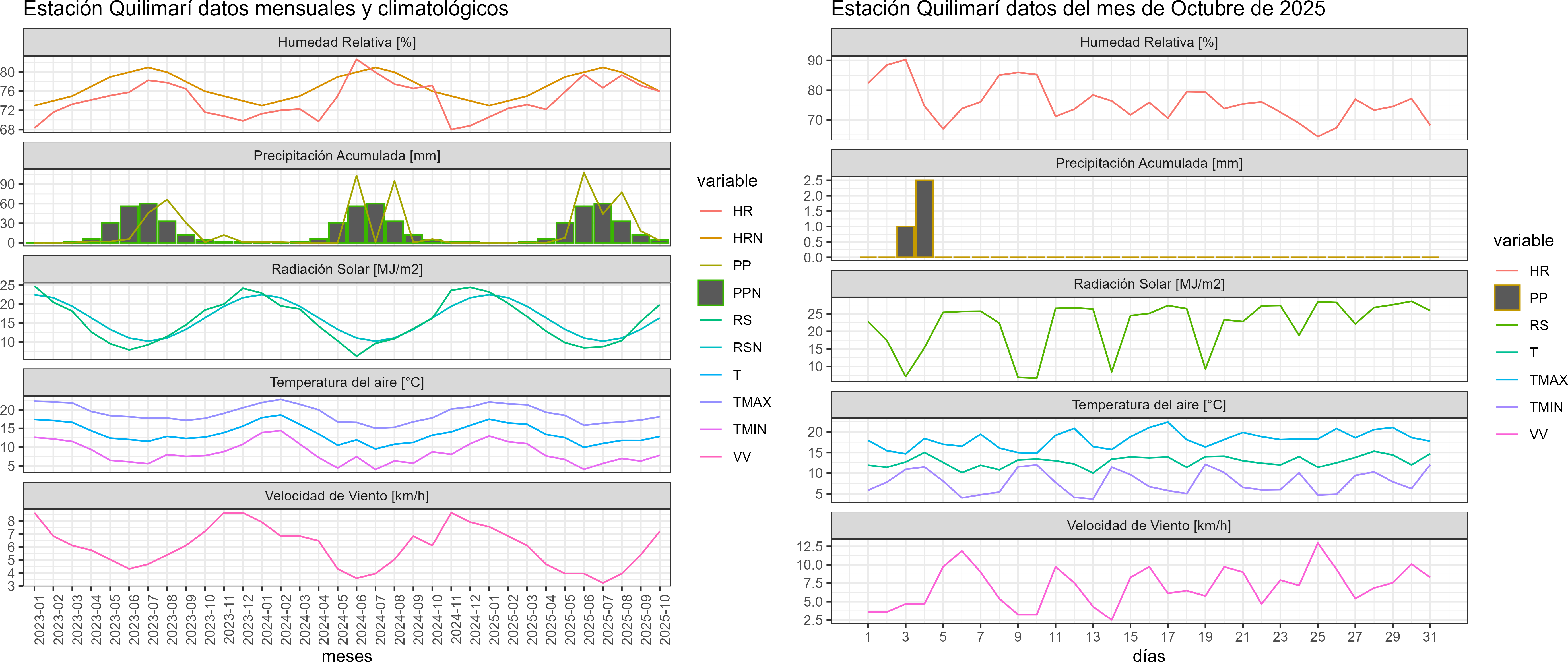 La estación Quilimarí corresponde al distrito agroclimático 4-1. Para este distrito climático la temperatura mínima, media y máxima climatológicas alcanzan los 8.1°C, 13.2°C y 18.2°C respectivamente. Por su parte, respecto a las temperaturas medidas durante el mes de octubre en la estación: la temperatura mínima alcanzo los 7.8°C (-0.3°C bajo la climatológica), la temperatura media 12.8°C (-0.4°C bajo la climatológica) y la temperatura máxima llegó a los 18.2°C (Igual la climatológico). En el mes de octubre se registró una pluviometría de 3.5 mm, lo cual representa un 38.9% con respecto al mismo mes de un año normal. De enero a octubre se ha registrado un total acumulado de 259.1 mm, en circunstancias que un año normal registraría a la fecha 229 mm, lo que representa un superávit de 13.1%. A la misma fecha, durante el año 2024 la precipitación alcanzaba los 5.7 mm.