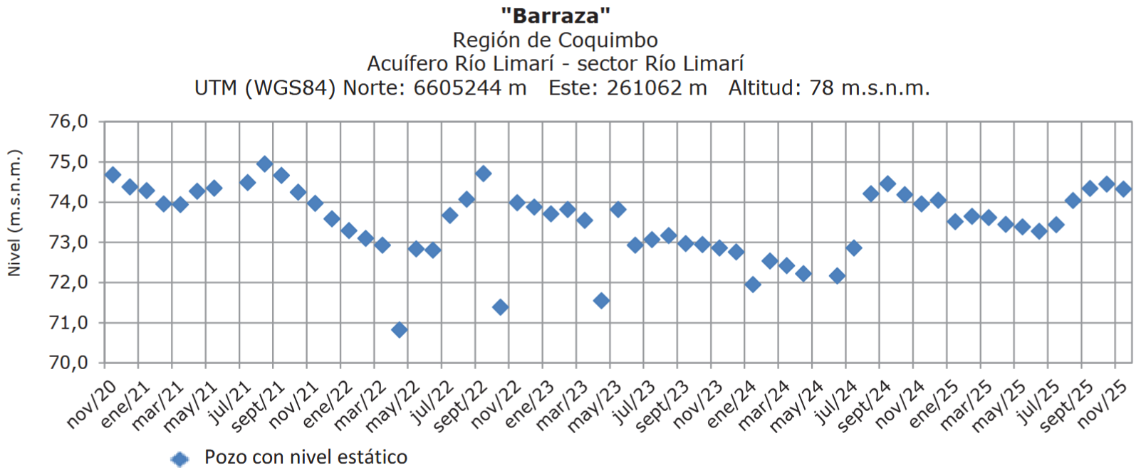 En el pozo Barraza (acuífero Río Limarí, sector Río Limarí), el nivel estático en diciembre se situó en torno a 74,5 m.s.n.m., equivalente a aproximadamente 3,3 m desde la superficie. Este valor se mantiene levemente por sobre los registros de comienzos de año, confirmando una incipiente recuperación del nivel freático durante 2025.