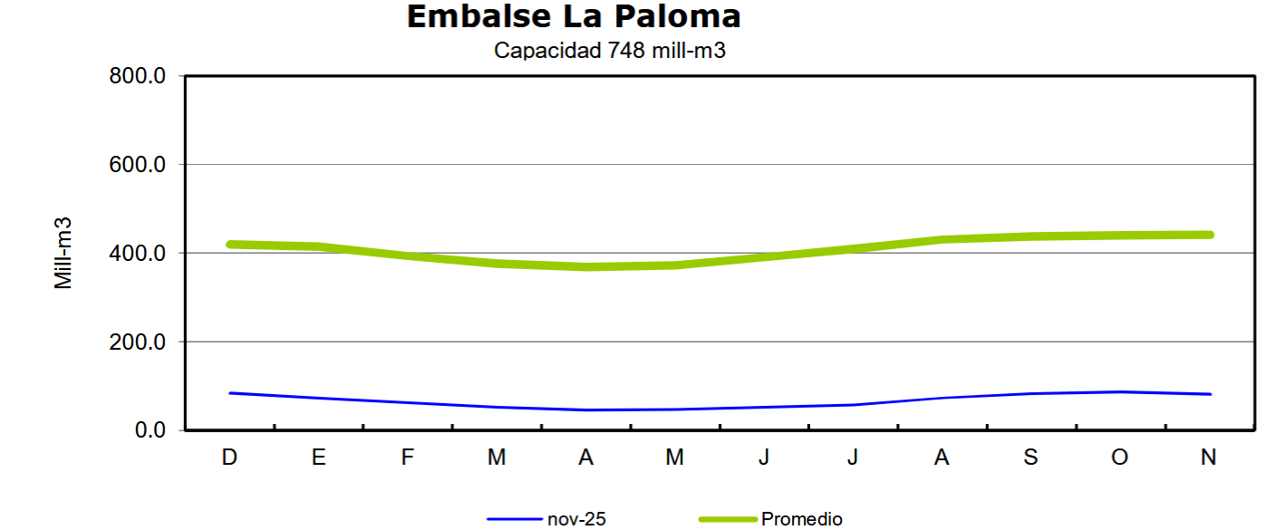 Por otro lado, el embalse La Paloma registró al 31 de diciembre un volumen de 81,9 millones de m3, lo que representa una disminución de 8,8% respecto al mismo mes de 2024 (89,9 millones de m3). Este valor equivale a cerca del 18% del promedio histórico mensual (442 millones de m3) y corresponde aproximadamente al 11% de su capacidad total de almacenamiento (748 millones de m3).