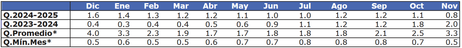 Así, para el período de noviembre la estación Río Elqui en Algarrobal registró un caudal de 2,2 m3/s, 80,5% por debajo del promedio histórico (11,3 m3/s), y 26,7% menor que en 2024 (3,0 m3/s). En relación al mes anterior (2,5 m3/s), el caudal disminuyó un 12,0%.