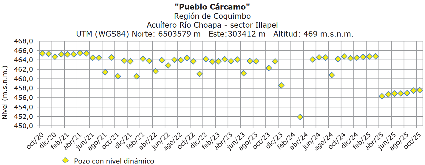 En el sector Illapel, el pozo Pueblo Cárcamo (acuífero Río Choapa, sector Illapel) mostró en diciembre un nivel en torno a 458 m.s.n.m., equivalente a cerca de 10 m desde la superficie. Este valor es similar al observado en los meses anteriores, aunque se mantiene por debajo de los niveles registrados entre 2022 y comienzos de 2024, evidenciando un descenso sostenido en el período más reciente.