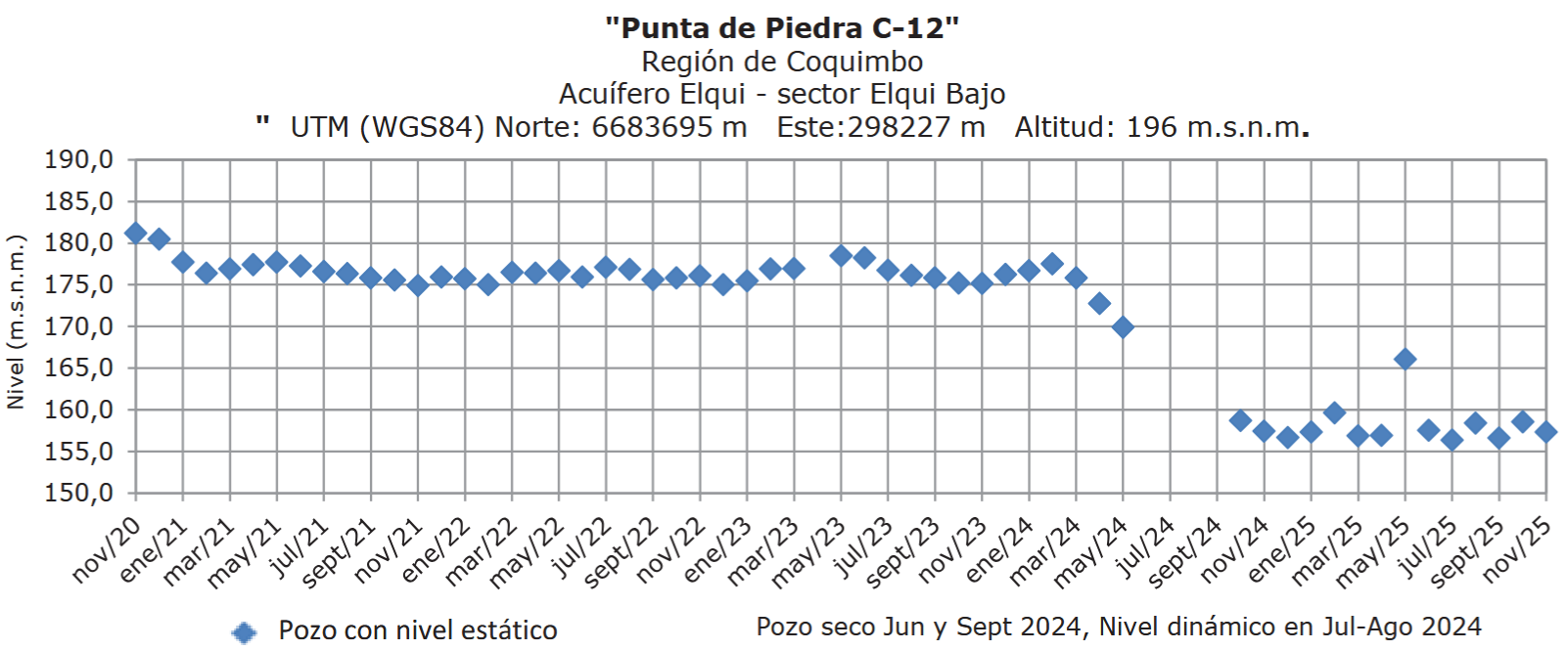El pozo Punta de Piedra (acuífero Elqui, sector Elqui Bajo) registró en diciembre un nivel estático en torno a 158 m.s.n.m., equivalente a unos 42 m desde la superficie, manteniéndose en valores similares a los observados en los meses previos y sin cambios significativos en la tendencia de los últimos meses.