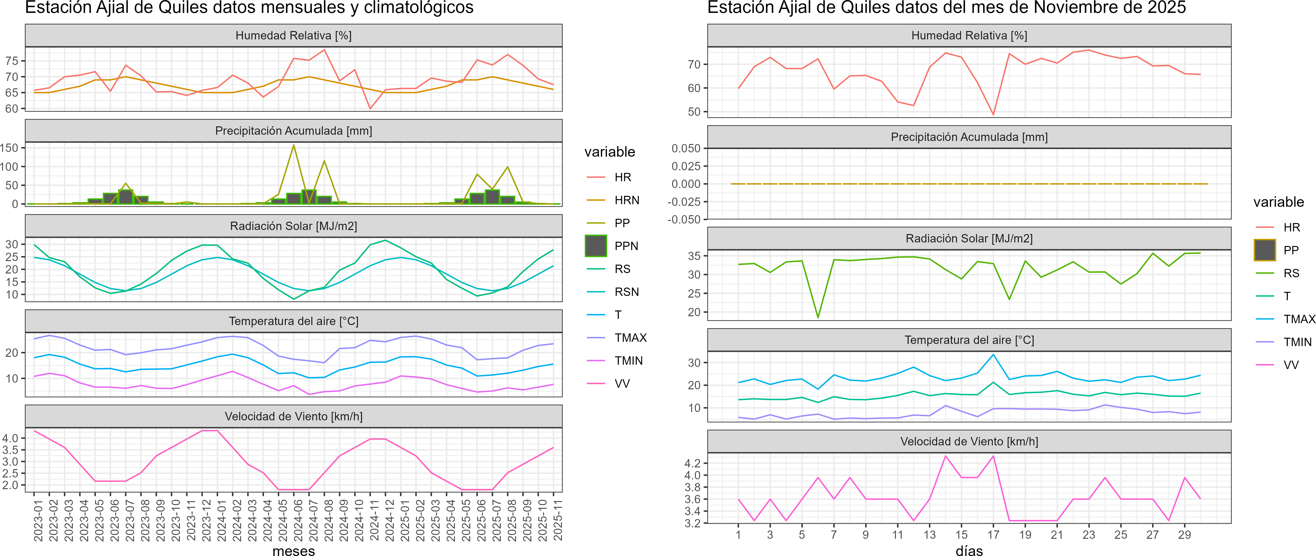 La estación Ajial de Quiles corresponde al distrito agroclimático 3-4-3. Para este distrito climático la temperatura mínima, media y máxima climatológicas alcanzan los 8.7°C, 15.3°C y 21.9°C respectivamente. Por su parte, respecto a las temperaturas medidas durante el mes de noviembre en la estación: la temperatura mínima alcanzo los 7.7°C (-1°C bajo la climatológica), la temperatura media 15.5°C (0.2°C sobre la climatológica) y la temperatura máxima llegó a los 23.4°C (1.5°C sobre la climatológica). En el mes de noviembre se registró una pluviometría de 0 mm, lo cual representa un 0% con respecto al mismo mes de un año normal. De enero a noviembre se ha registrado un total acumulado de 227 mm, en circunstancias que un año normal registraría a la fecha 184 mm, lo que representa un superávit de 23.4%. A la misma fecha, durante el año 2024 la precipitación alcanzaba los 0 mm.