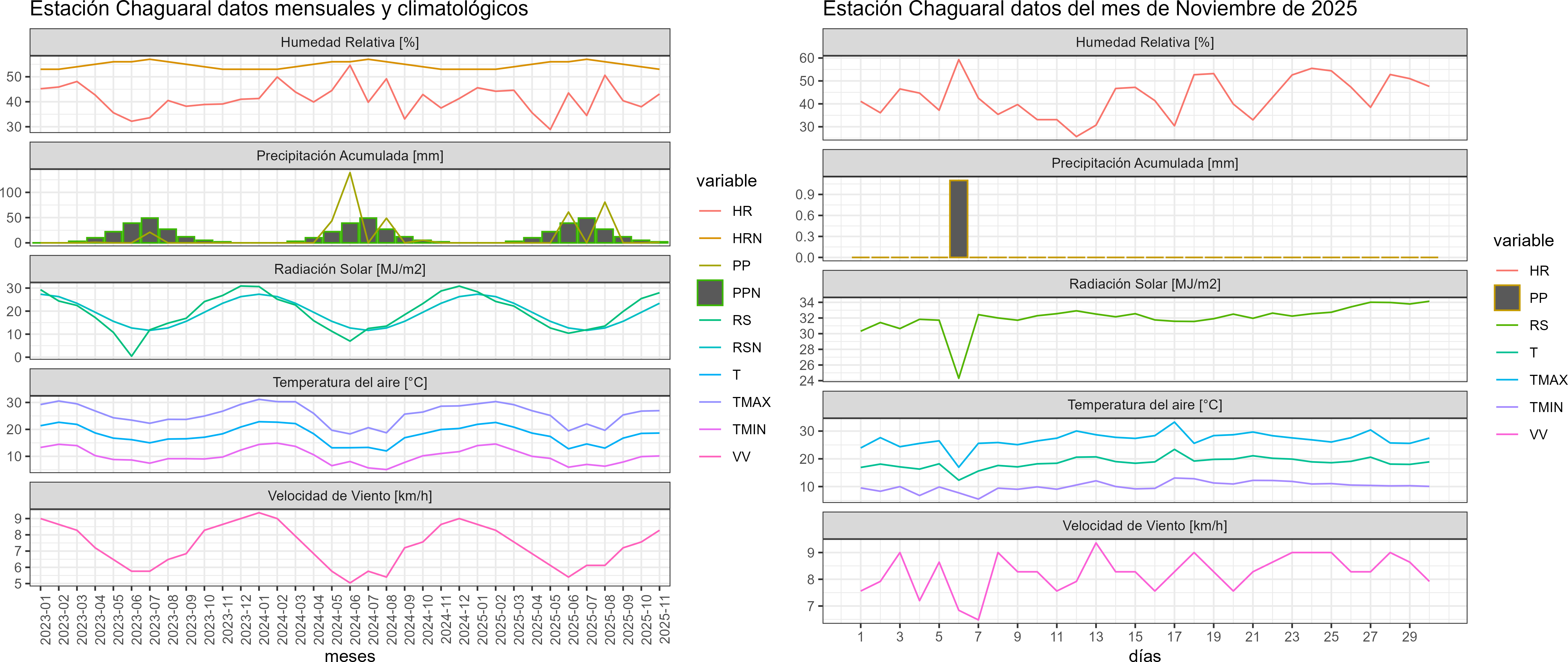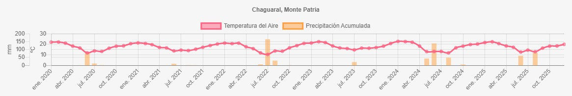 La estación Chaguaral corresponde al distrito agroclimático 4-7. Para este distrito climático la temperatura mínima, media y máxima climatológicas alcanzan los 9.9°C, 17.4°C y 25°C respectivamente. Por su parte, respecto a las temperaturas medidas durante el mes de noviembre en la estación: la temperatura mínima alcanzo los 10.1°C (0.2°C sobre la climatológica), la temperatura media 18.6°C (1.2°C sobre la climatológica) y la temperatura máxima llegó a los 27°C (2°C sobre la climatológica). En el mes de noviembre se registró una pluviometría de 1.1 mm, lo cual representa un 22% con respecto al mismo mes de un año normal. De enero a noviembre se ha registrado un total acumulado de 143 mm, en circunstancias que un año normal registraría a la fecha 238 mm, lo que representa un déficit de 39.9%. A la misma fecha, durante el año 2024 la precipitación alcanzaba los 0 mm.