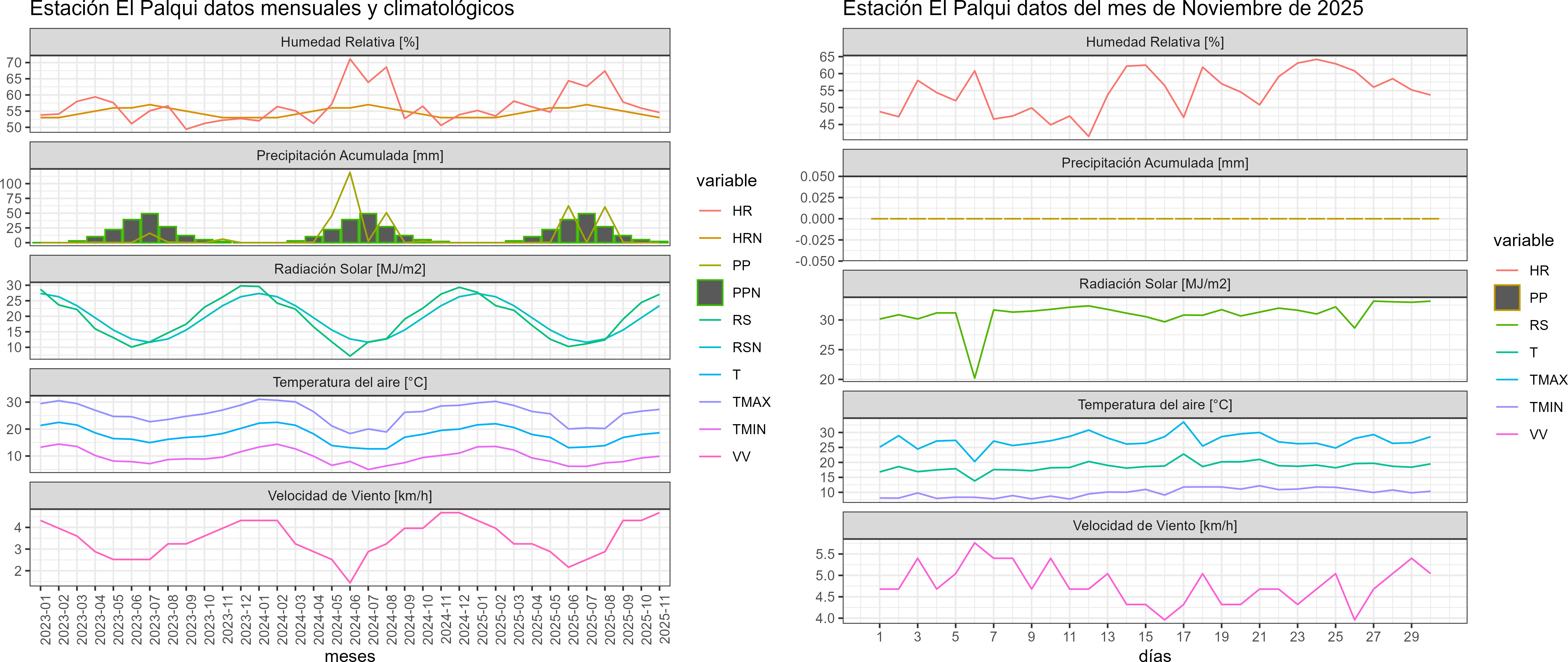 La estación El Palqui corresponde al distrito agroclimático 4-7. Para este distrito climático la temperatura mínima, media y máxima climatológicas alcanzan los 10.5°C, 19.5°C y 28.5°C respectivamente. Por su parte, respecto a las temperaturas medidas durante el mes de noviembre en la estación: la temperatura mínima alcanzo los 9.9°C (-0.6°C bajo la climatológica), la temperatura media 18.6°C (-0.9°C bajo la climatológica) y la temperatura máxima llegó a los 27.3°C (-1.2°C bajo la climatológica). En el mes de noviembre se registró una pluviometría de 0 mm, lo cual representa un 0% con respecto al mismo mes de un año normal. De enero a noviembre se ha registrado un total acumulado de 125 mm, en circunstancias que un año normal registraría a la fecha 179 mm, lo que representa un déficit de 30.2%. A la misma fecha, durante el año 2024 la precipitación alcanzaba los 0 mm.