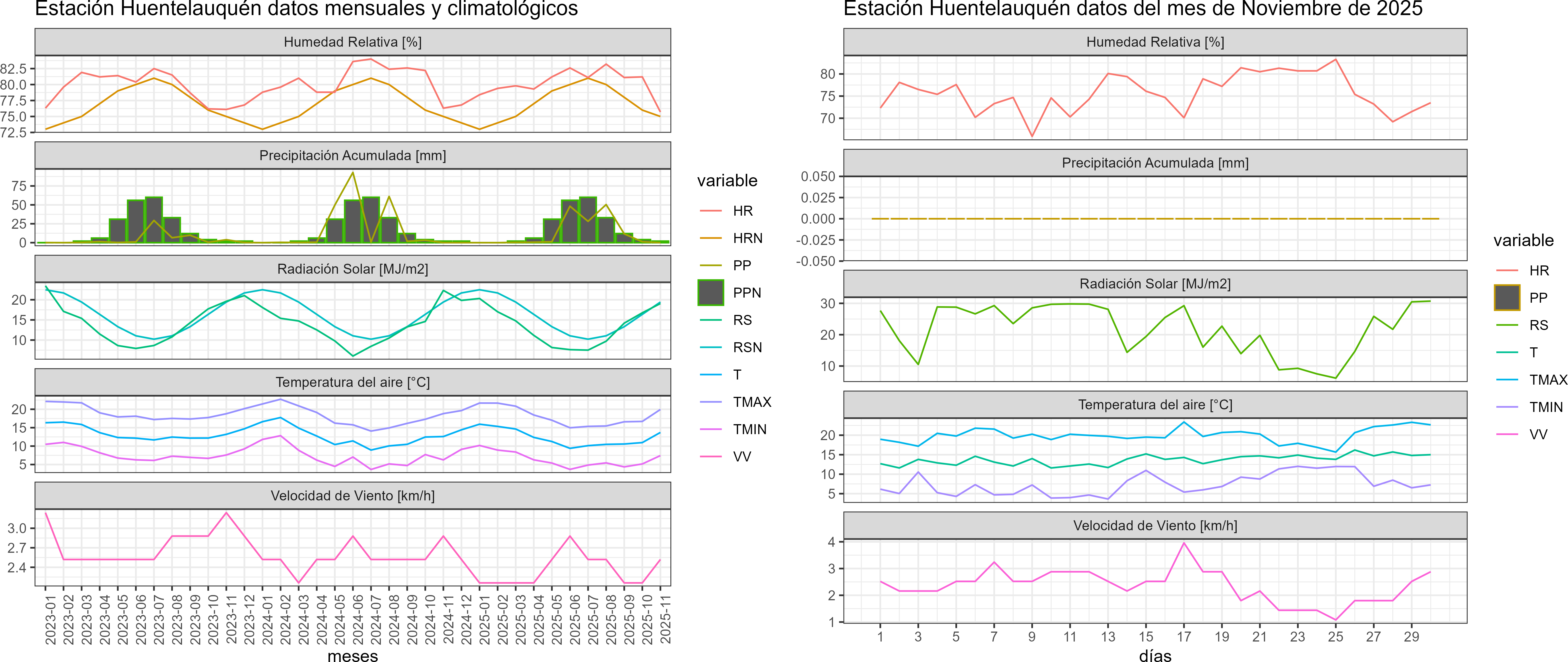 La estación Huentelauquén corresponde al distrito agroclimático 4-1. Para este distrito climático la temperatura mínima, media y máxima climatológicas alcanzan los 9.8°C, 14.6°C y 19.3°C respectivamente. Por su parte, respecto a las temperaturas medidas durante el mes de noviembre en la estación: la temperatura mínima alcanzo los 7.4°C (-2.4°C bajo la climatológica), la temperatura media 13.7°C (-0.9°C bajo la climatológica) y la temperatura máxima llegó a los 19.9°C (0.6°C sobre la climatológica). En el mes de noviembre se registró una pluviometría de 0 mm, lo cual representa un 0% con respecto al mismo mes de un año normal. De enero a noviembre se ha registrado un total acumulado de 141.8 mm, en circunstancias que un año normal registraría a la fecha 158 mm, lo que representa un déficit de 10.3%. A la misma fecha, durante el año 2024 la precipitación alcanzaba los 0 mm.