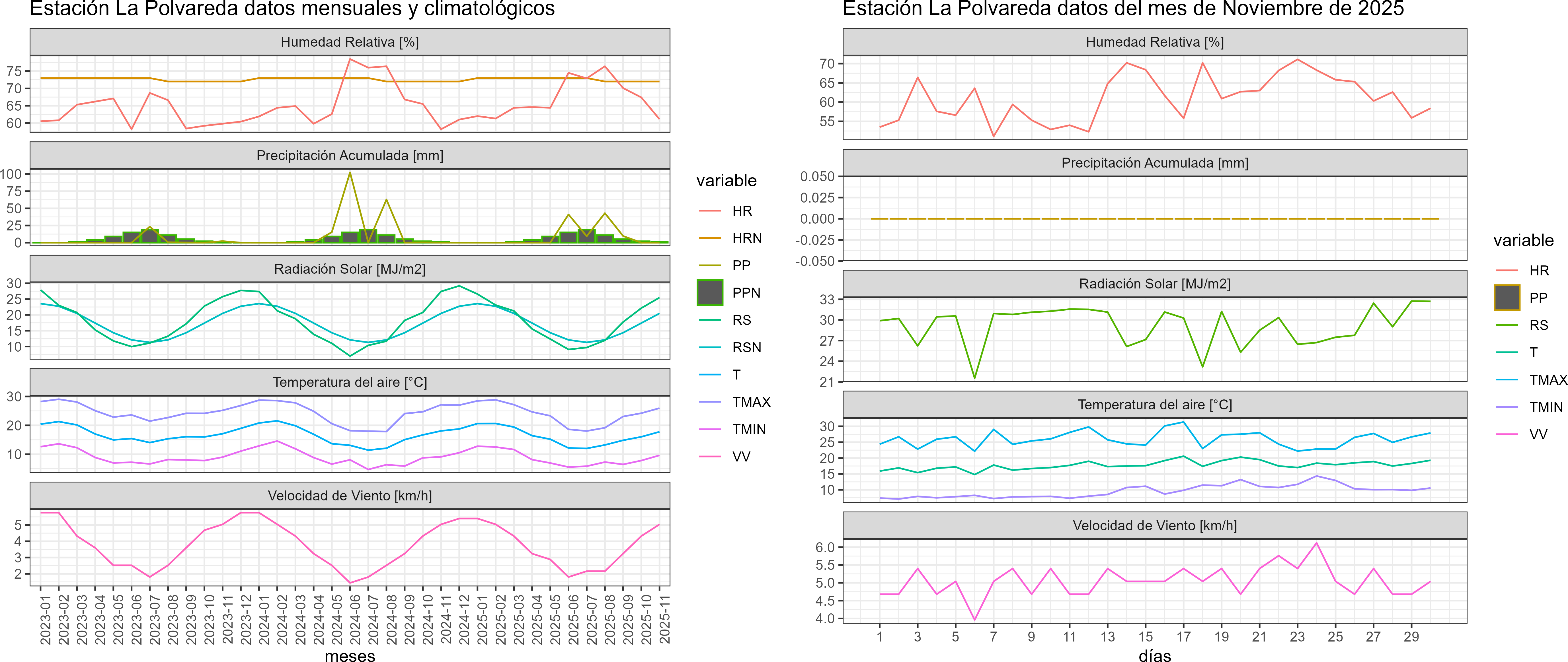 La estación La Polvareda corresponde al distrito agroclimático 3-4-2. Para este distrito climático la temperatura mínima, media y máxima climatológicas alcanzan los 9.1°C, 17.5°C y 25.9°C respectivamente. Por su parte, respecto a las temperaturas medidas durante el mes de noviembre en la estación: la temperatura mínima alcanzo los 9.6°C (0.5°C sobre la climatológica), la temperatura media 17.8°C (0.3°C sobre la climatológica) y la temperatura máxima llegó a los 26°C (0.1°C sobre la climatológica). En el mes de noviembre se registró una pluviometría de 0 mm, lo cual representa un 0% con respecto al mismo mes de un año normal. De enero a noviembre se ha registrado un total acumulado de 103.3 mm, en circunstancias que un año normal registraría a la fecha 166 mm, lo que representa un déficit de 37.8%. A la misma fecha, durante el año 2024 la precipitación alcanzaba los 0 mm.