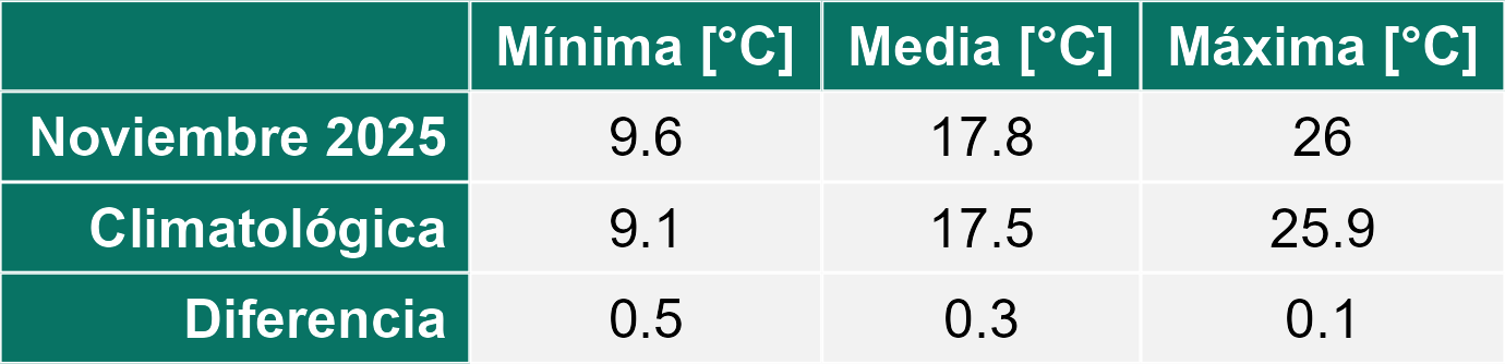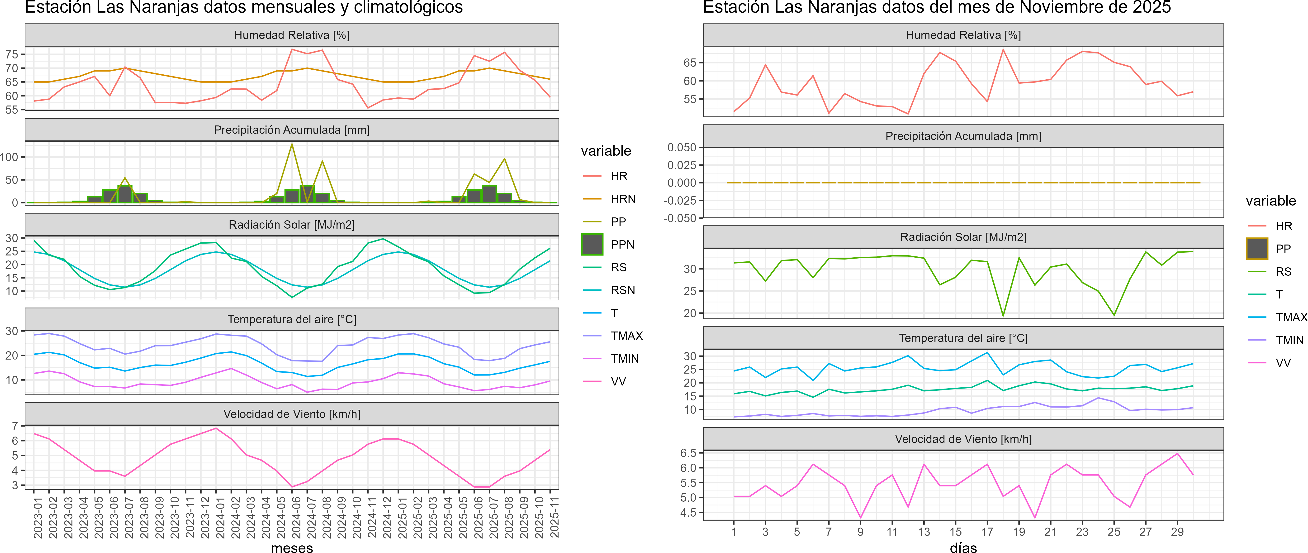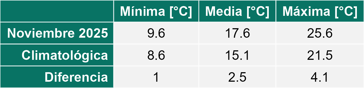 La estación Las Naranjas corresponde al distrito agroclimático 3-4-3. Para este distrito climático la temperatura mínima, media y máxima climatológicas alcanzan los 8.6°C, 15.1°C y 21.5°C respectivamente. Por su parte, respecto a las temperaturas medidas durante el mes de noviembre en la estación: la temperatura mínima alcanzo los 9.6°C (1°C sobre la climatológica), la temperatura media 17.6°C (2.5°C sobre la climatológica) y la temperatura máxima llegó a los 25.6°C (4.1°C sobre la climatológica). En el mes de noviembre se registró una pluviometría de 0 mm, lo cual representa un 0% con respecto al mismo mes de un año normal. De enero a noviembre se ha registrado un total acumulado de 213.9 mm, en circunstancias que un año normal registraría a la fecha 180 mm, lo que representa un superávit de 18.8%. A la misma fecha, durante el año 2024 la precipitación alcanzaba los 0 mm.